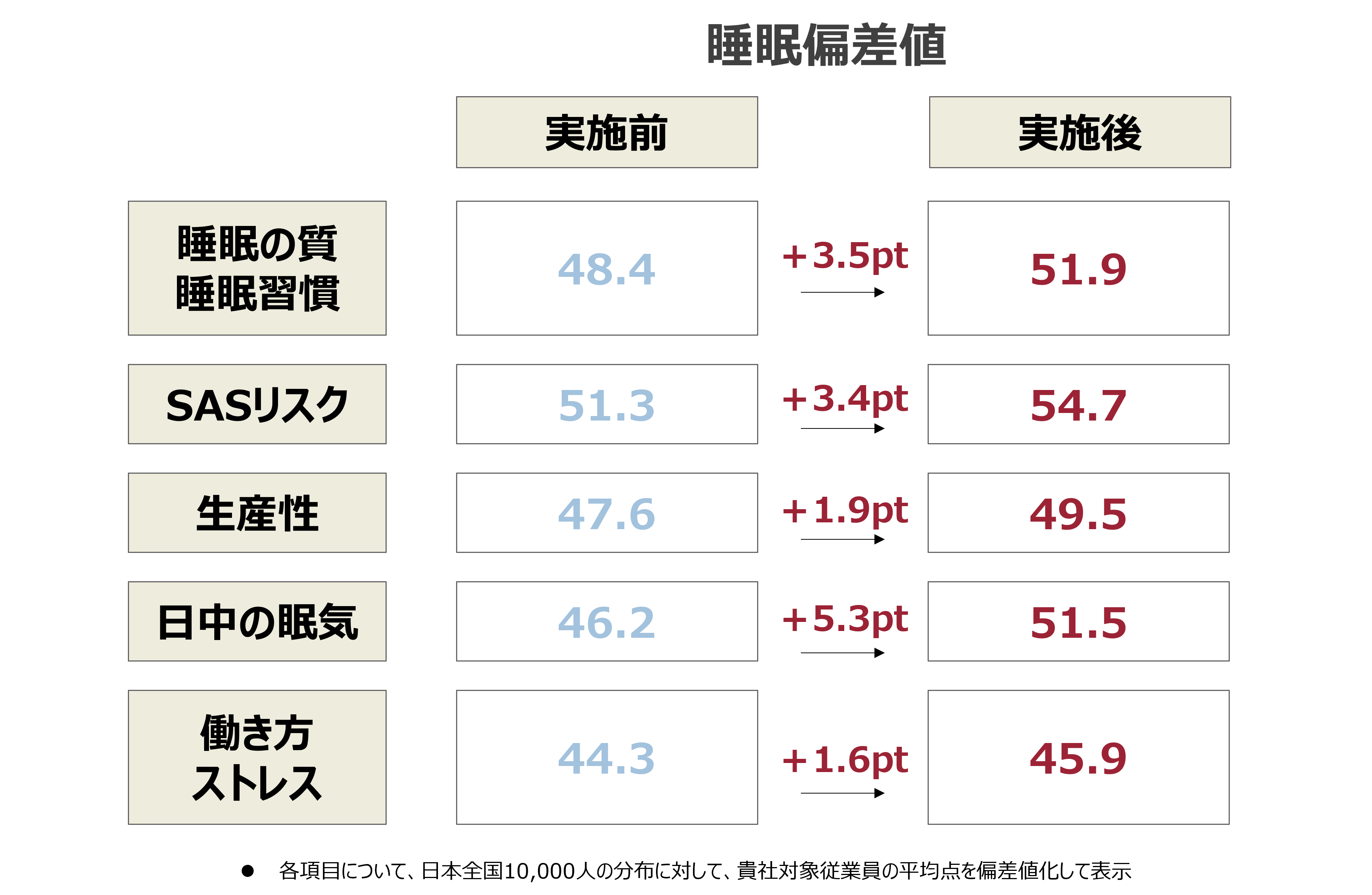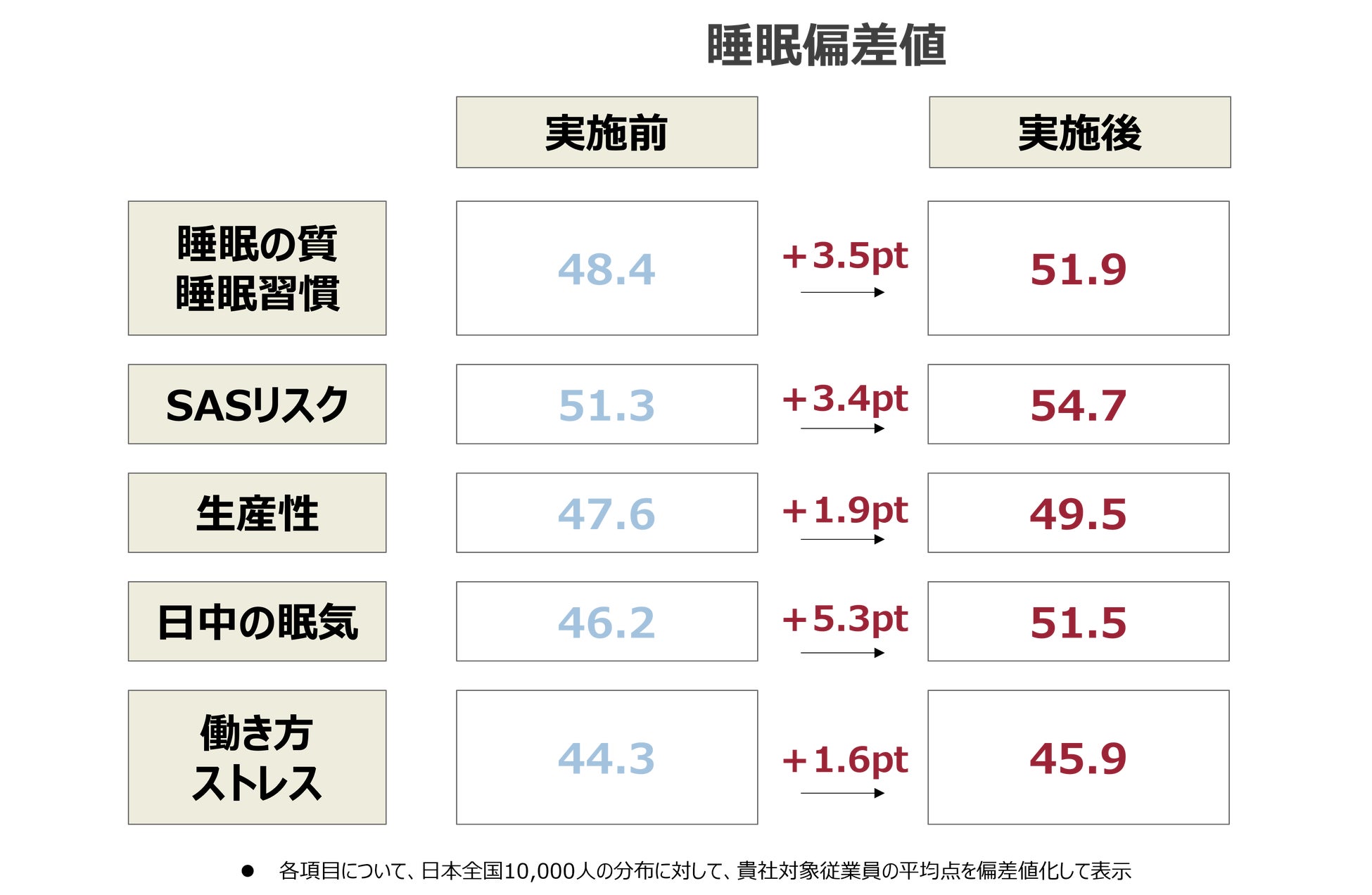 本検証結果から、継続的な睡眠改善行動が、睡眠時間や労働時間に変化がない中、睡眠偏差値*1や睡眠の質、日中の眠気の軽減、生産性の向上に寄与することが分かりました。