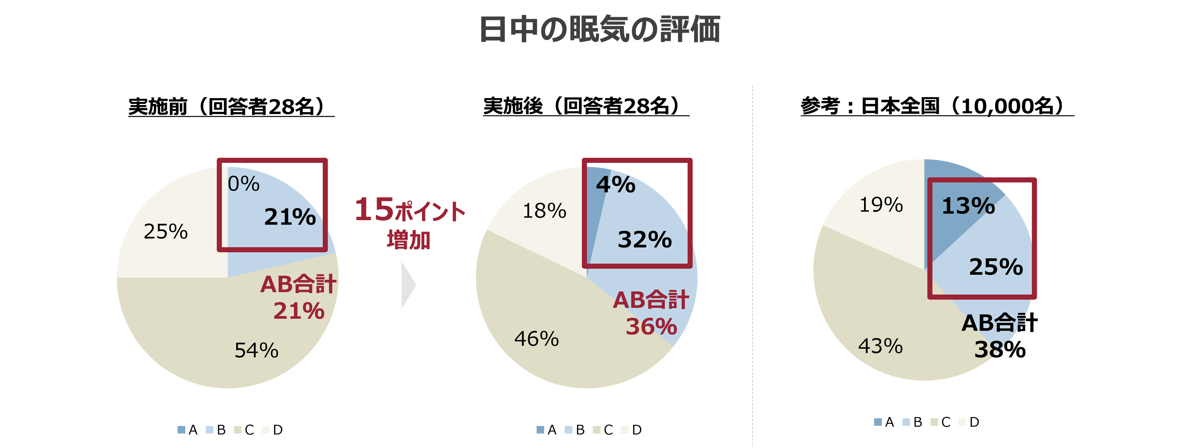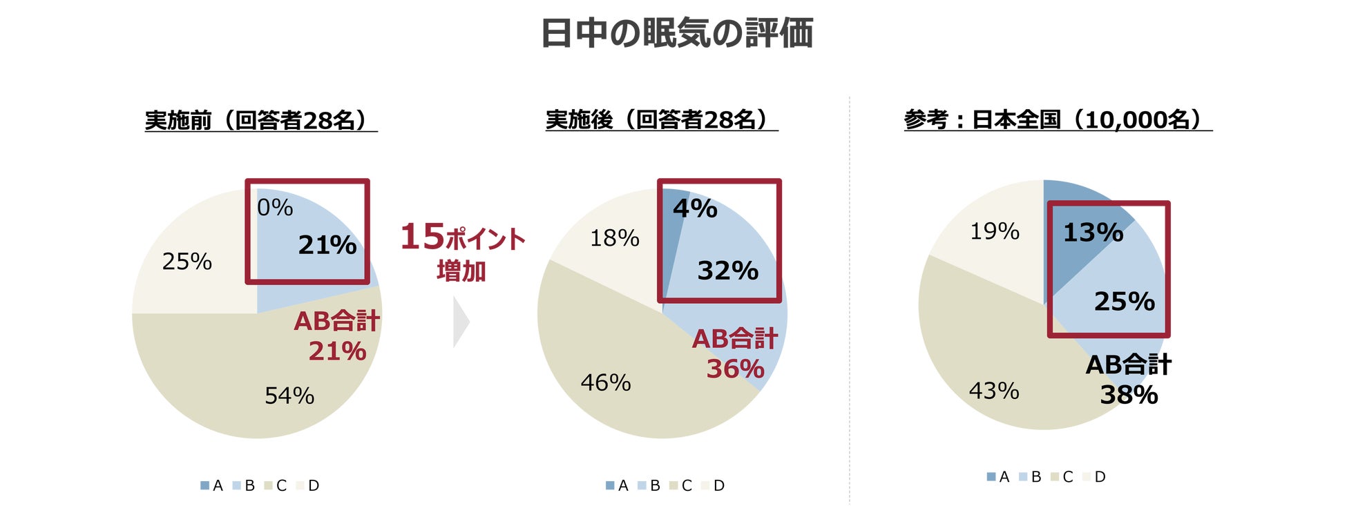 日中の眠気は4段階で評価され、DからAにかけてよい評価となります。A評価およびB評価に該当する人は、それぞれ実施前の0%、21%(AB合計21%)から、実施後の4%、32%(AB合計36%)に4ポイント、11ポイント(AB合計15ポイント)改善しました。