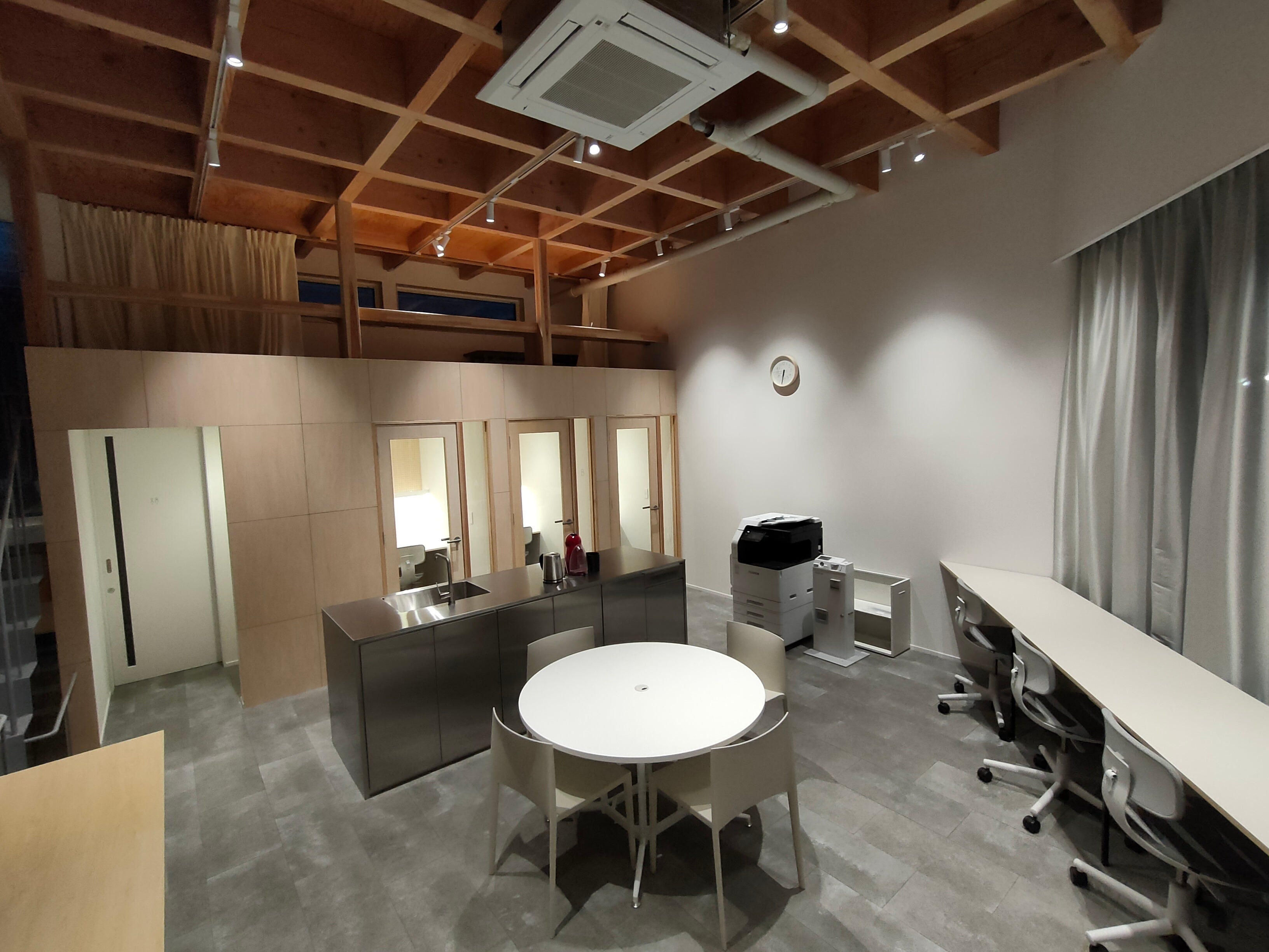 窓に面したカウンター席と共同作業に適した丸テーブルがあるコワーキングスペース。アイランドキッチンの奥に、3つの完全個室をご用意。テレカンや集中したい作業があるときに最適です。