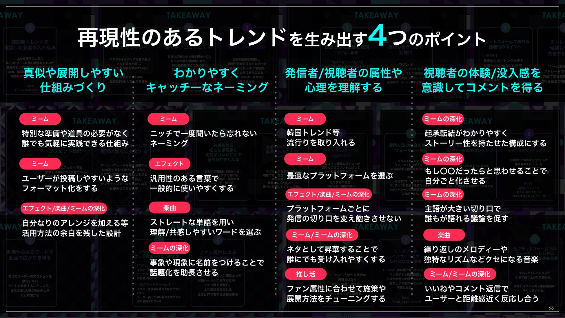 「再現しやすい要素」を持つ、『ミーム』『エフェクト/楽曲』『コンテンツ』『推し活』という4つのカテゴリーのハッシュタグを分析したところ、再現性のあるトレンドを生み出す4つのポイントが明らかになりました。