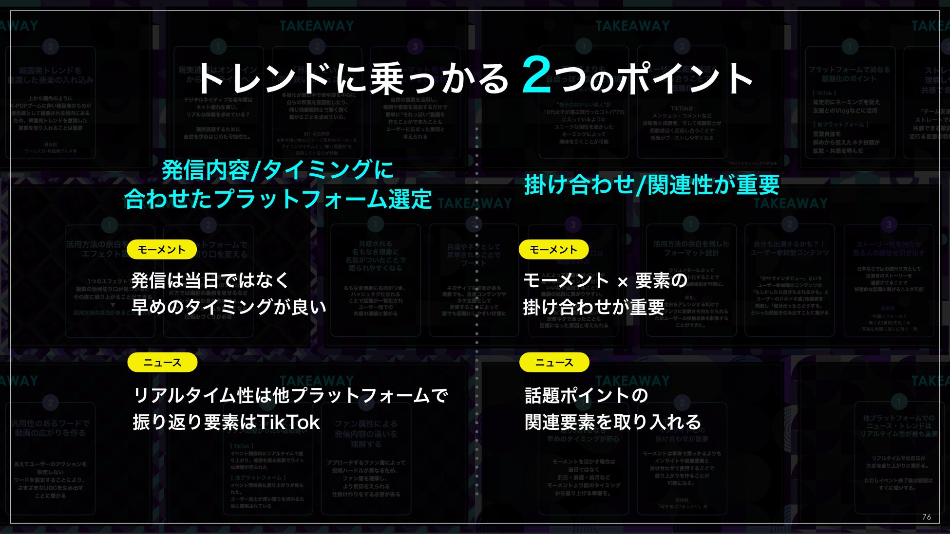 「乗っかりやすい要素」を持つ、『モーメント』『ニュース』という2つのカテゴリーのハッシュタグを分析したところ、トレンドに乗っかり、盛り上がりを作るための2つのポイントが明らかになりました。