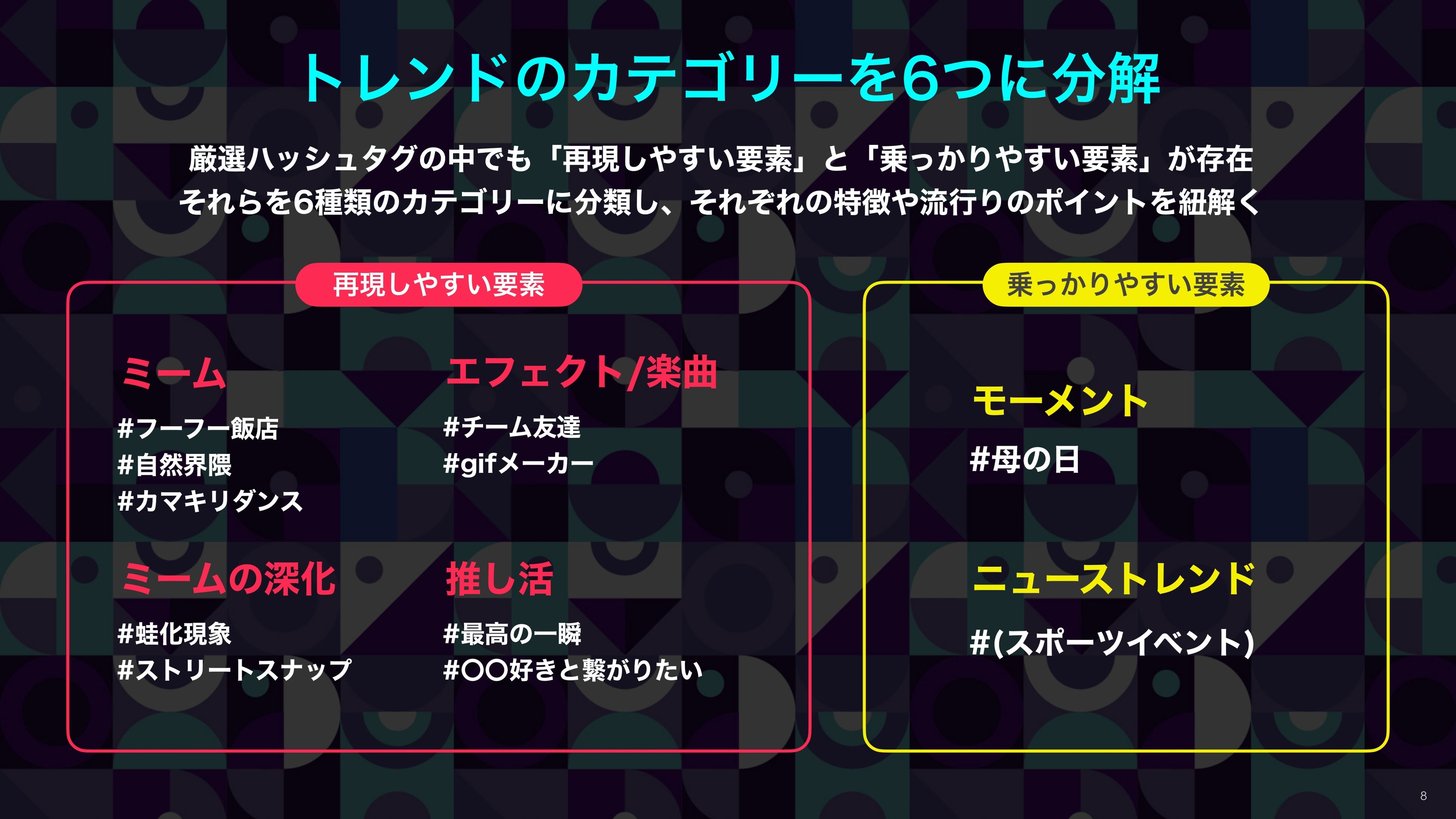 本レポートの制作にあたり、2023年から2024年にかけて顕著な増加が見受けられた1,000を超えるハッシュタグの中から「再現しやすい要素」と「乗っかりやすい要素」が存在するハッシュタグを厳選し、それらを6種類のカテゴリーに分類。「#フーフー飯店」や「#自然界隈」といったTikTokトレンドを牽引したハッシュタグを分析し、「いつトレンドが発生したのか」「なぜ盛り上がったのか」などトレンドのメカニズムを紐解きました。