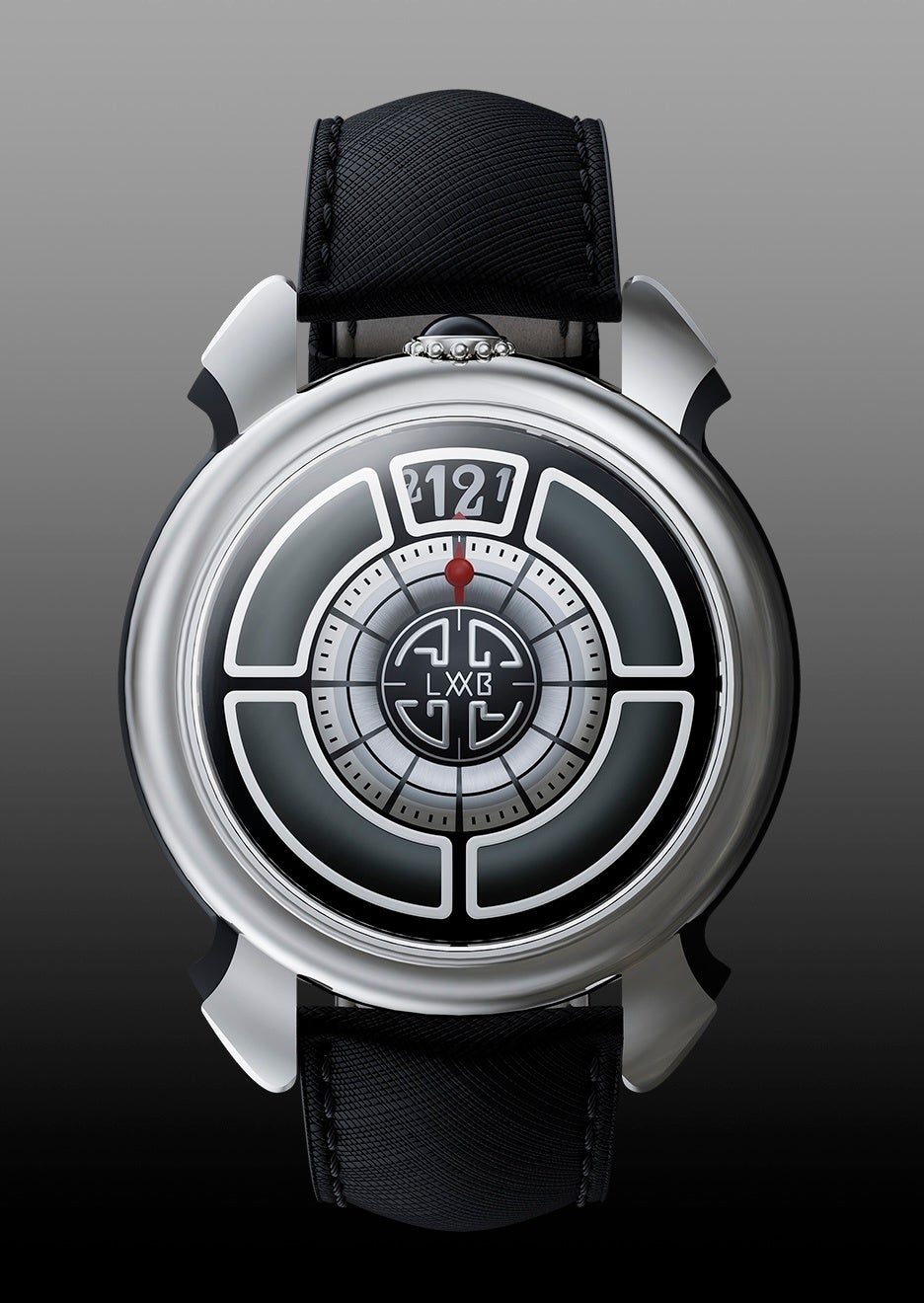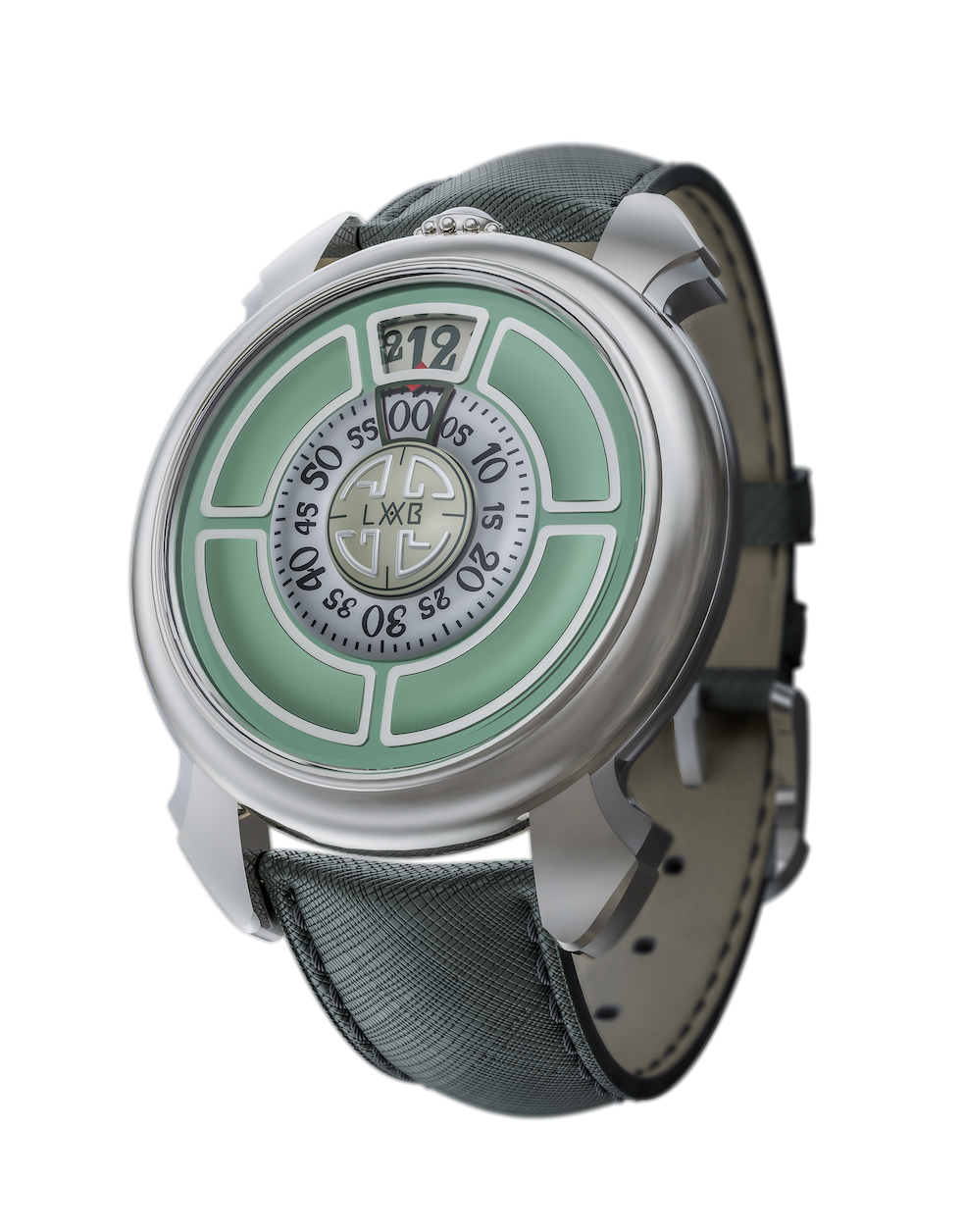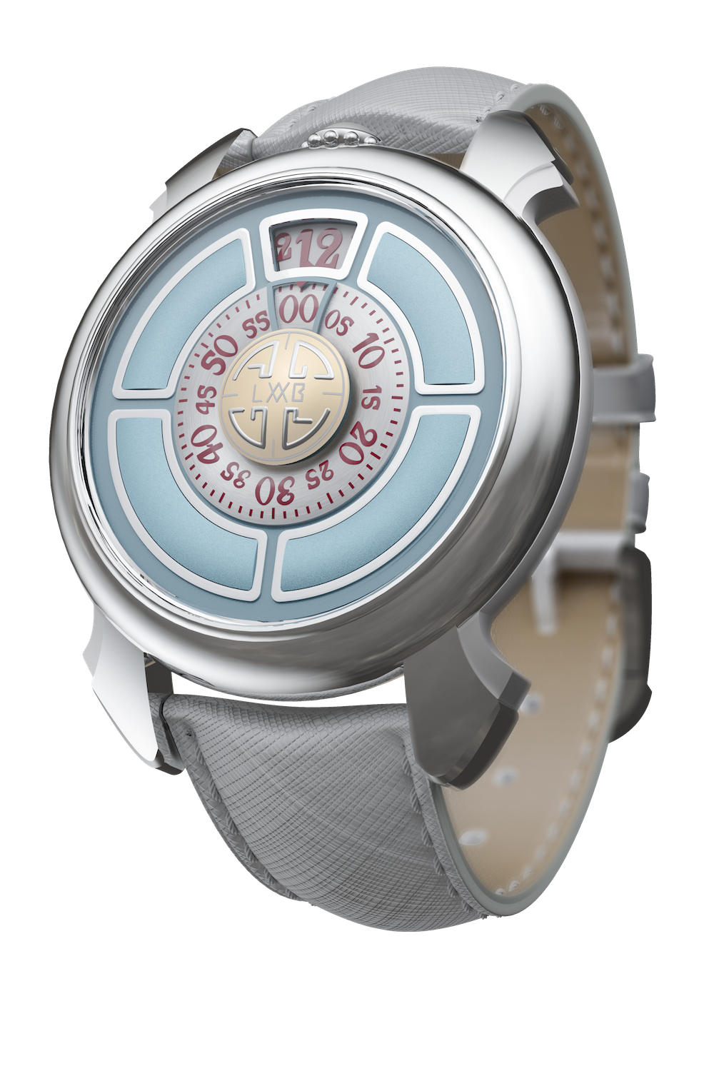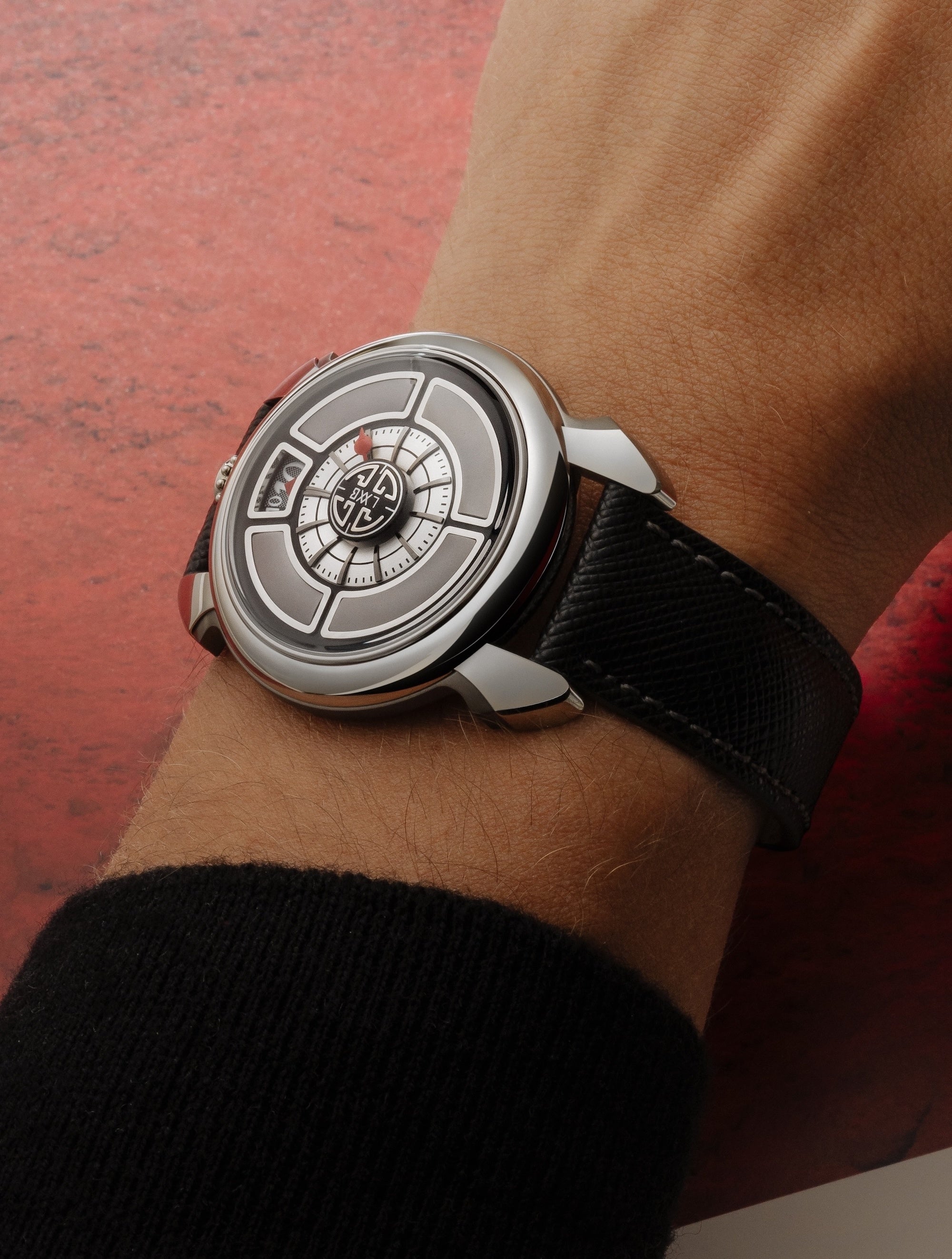 特徴:ケース12時位置にリュウズを配置。文字盤12時位置にディスク式の時表示、中央に分表示ダイヤルと、その内側にロゴを刻み込んだ円形のスモールセコンド。