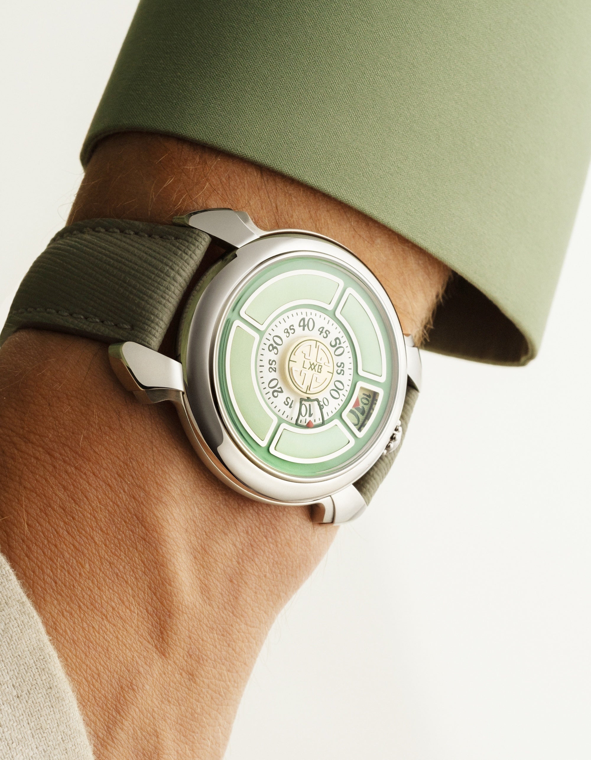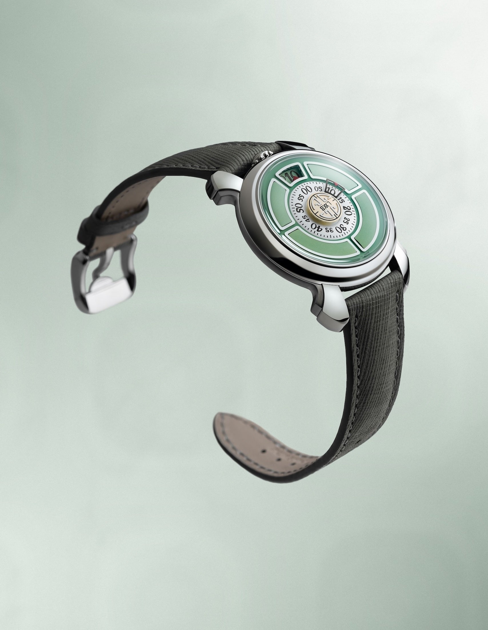 「 Cinquanta」のフォルムには、世界が平和を取り戻し始めた1950年代のしなやかさと生命力が息づいています。イタリアの高度経済成長期において、日用品が芸術品へと昇華していった時代の息吹と、クロームが輝く“スペースカー”やジェット時代の奇跡、華やかなジュークボックスが彩ったアメリカの喧騒――その両方からインスピレーションを受けています。パステルカラーと時代を象徴するデザイン要素が、このモデルの美的特徴を形作っています。分表示トラックのクリエイティブな表現が、このタイムピースに独自の個性を添えています。