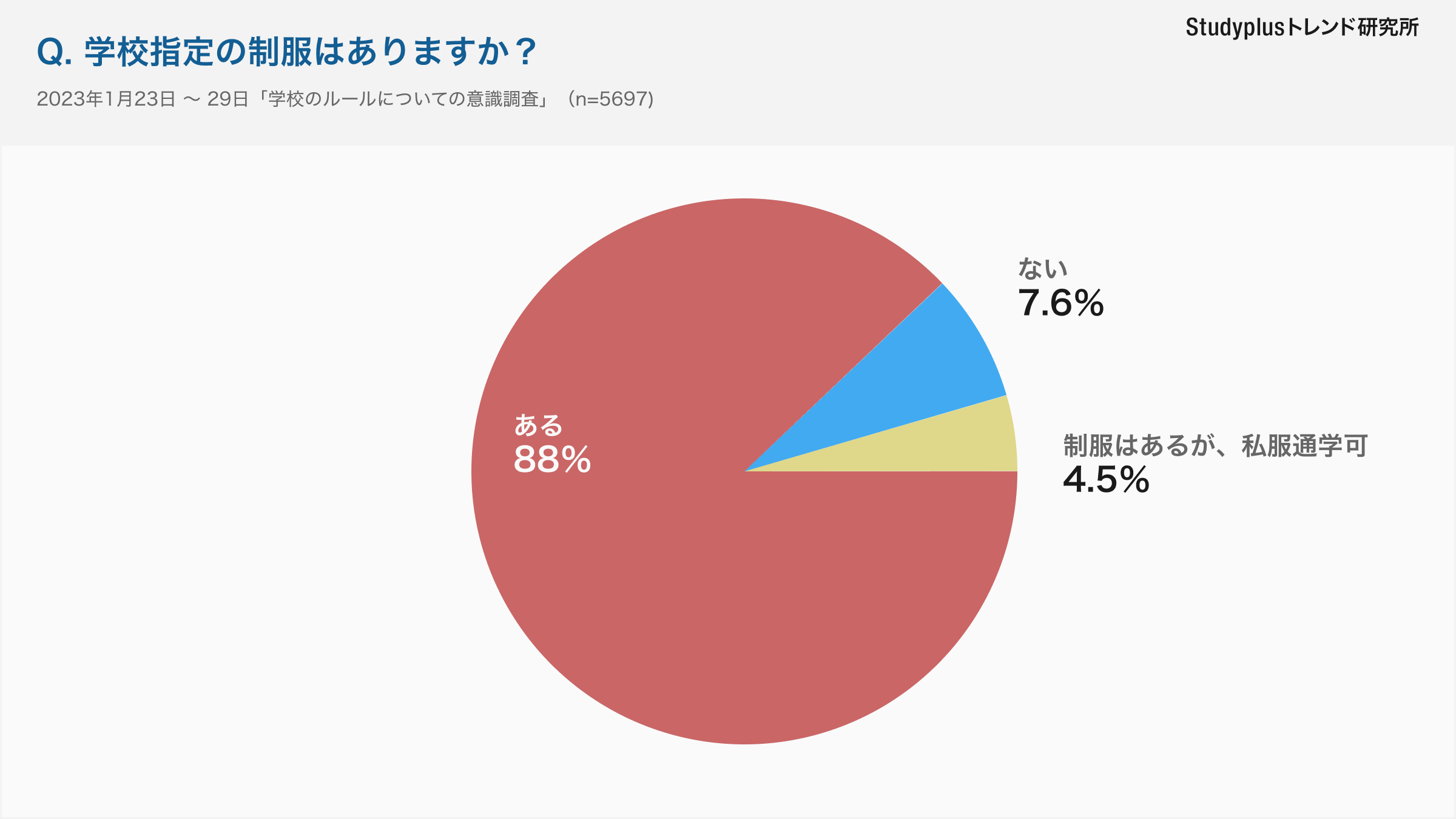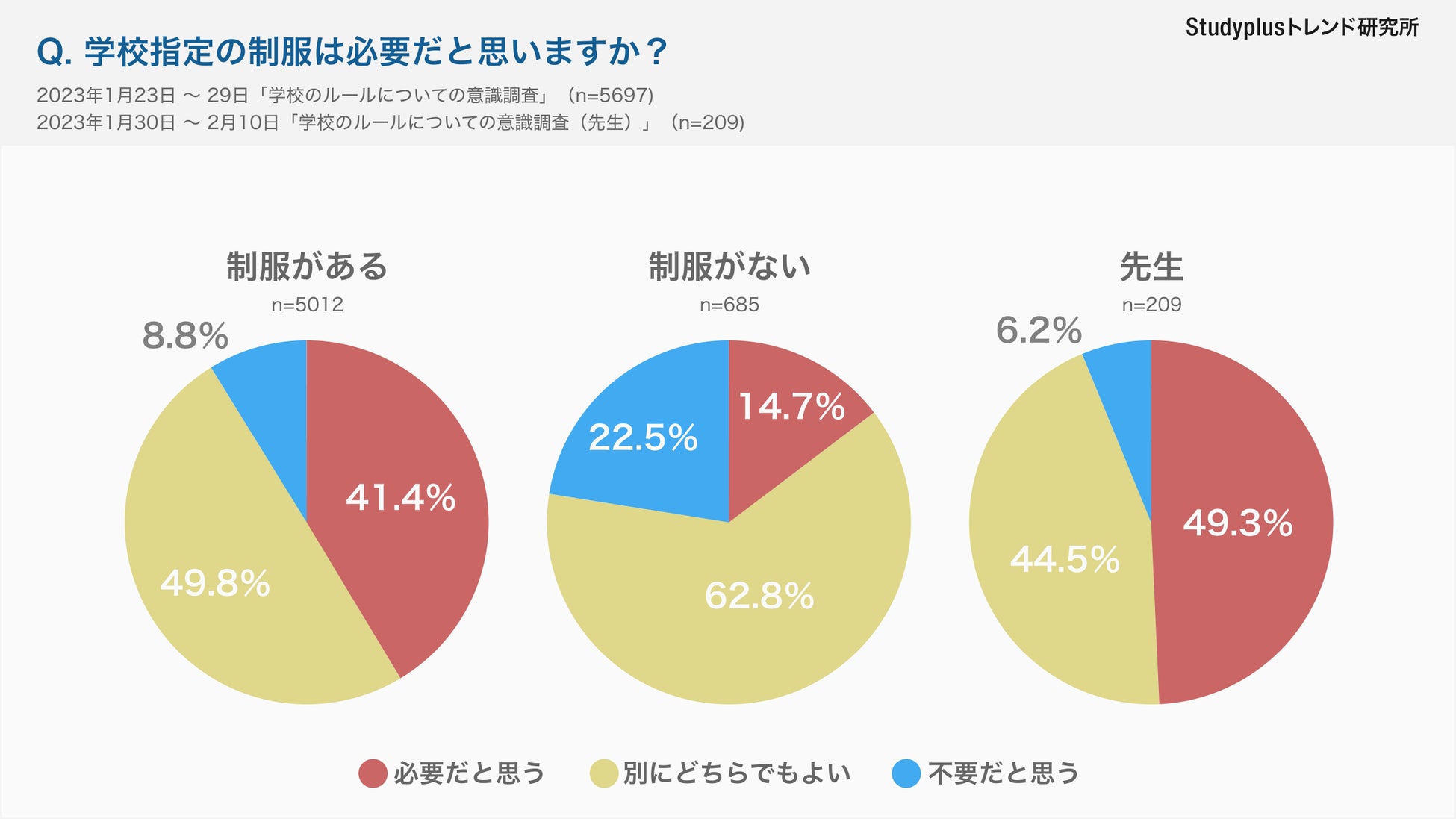 スタディプラス株式会社(本社:東京都千代田区、代表取締役:廣瀬高志、以下スタディプラス)のStudyplusトレンド研究所は、2023年1月23日(月)から1月29日(日)にかけて学習管理アプリ「Studyplus」上で全国の中学1年生から高校3年生(※学年は2022年度時点)を対象に、2023年1月30日(月)から2月10日(金)にかけて全国の高等学校の教員を対象に「学校のルールについての意識調査」を実施、中高生5,697名・高校教員209名から回答を得ましたのでご報告いたします。本リリースでは、制服および校則に関連した結果をご紹介します。