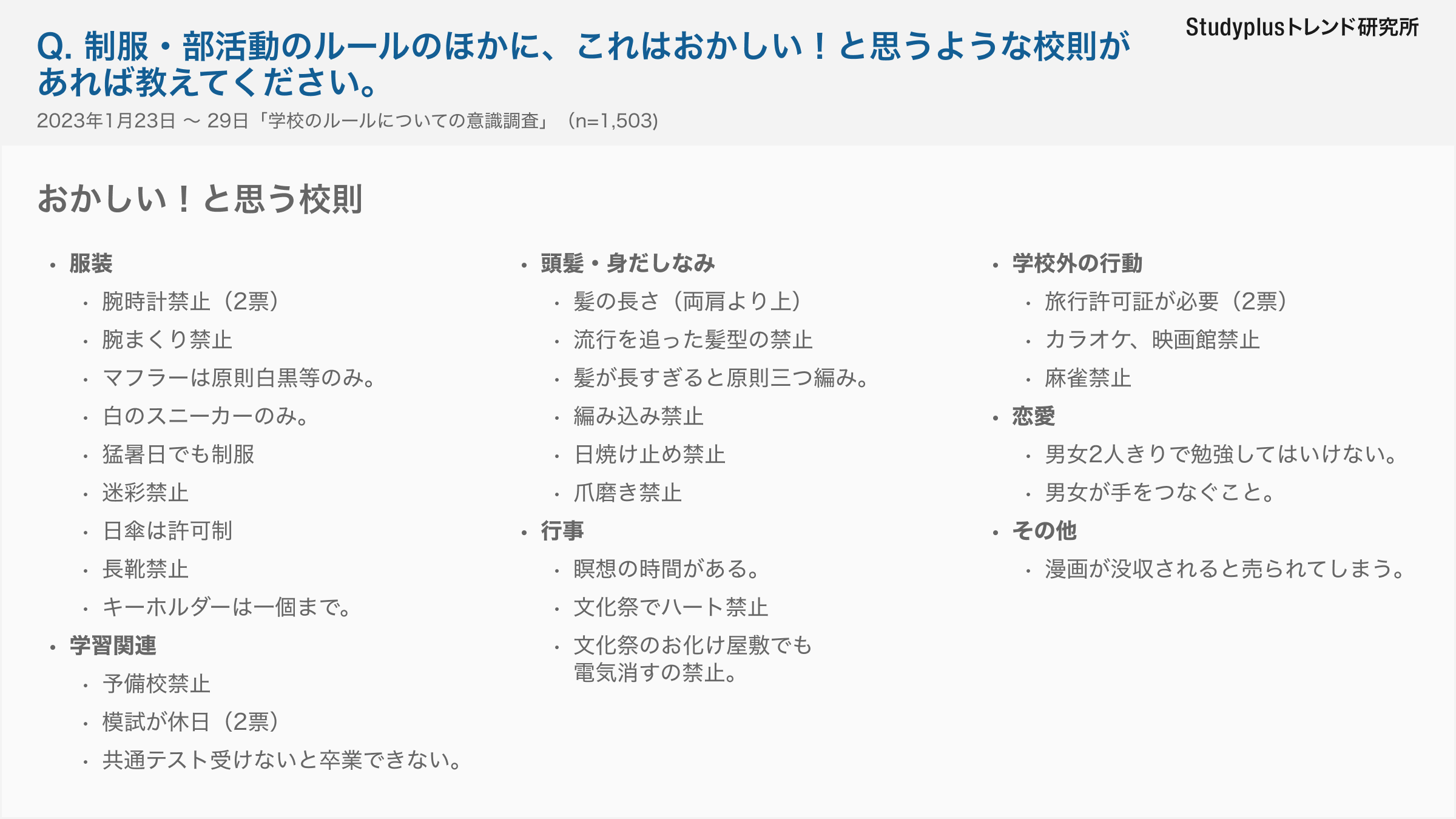・制服・部活動のルールのほかに、これはおかしい!と思うような校則があれば教えてください。※中高生1,503名が任意回答