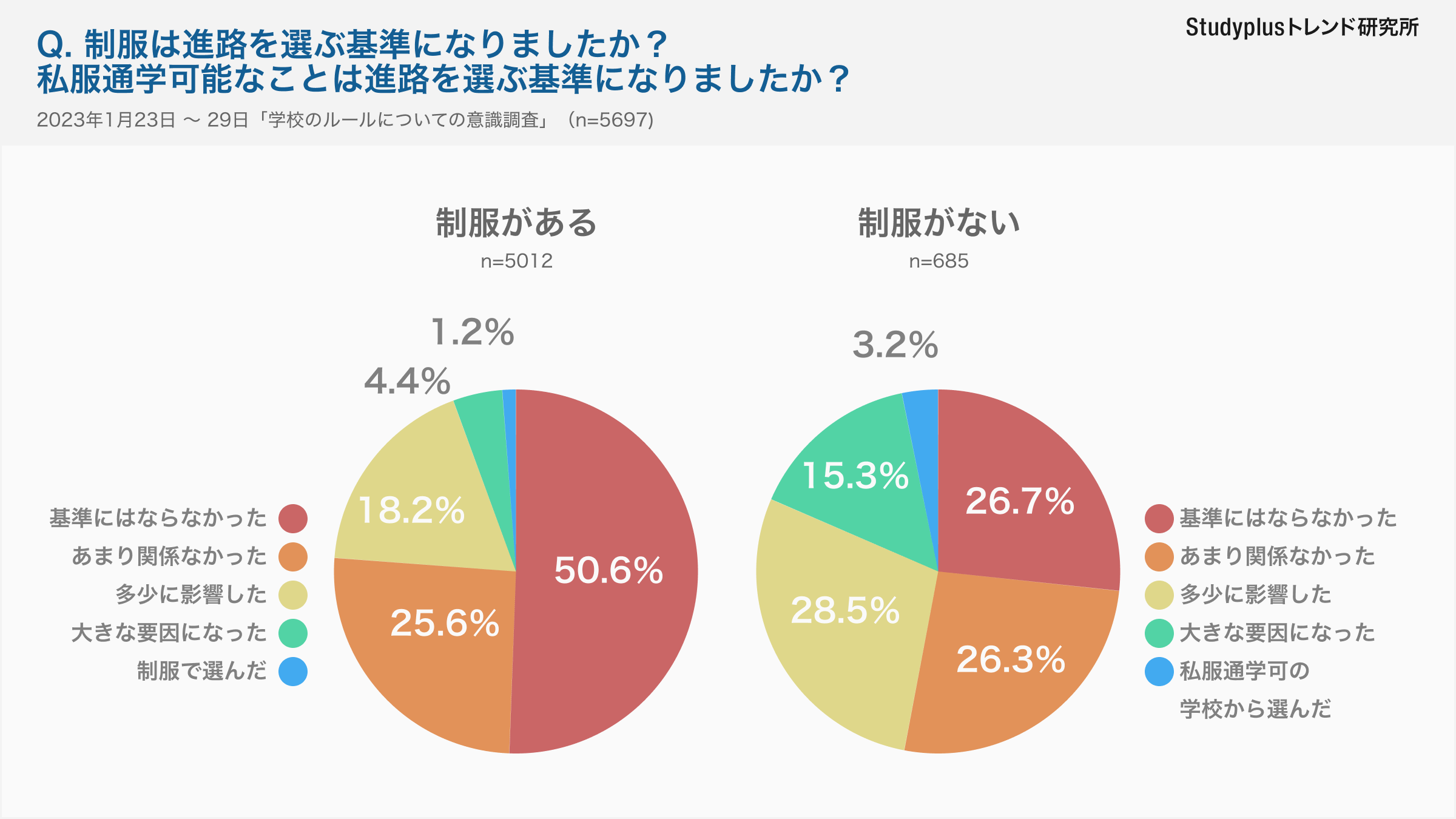 ・制服は進路を選ぶ基準になりましたか?私服通学可能なことは進路を選ぶ基準になりましたか? ※中高生5,697名が回答