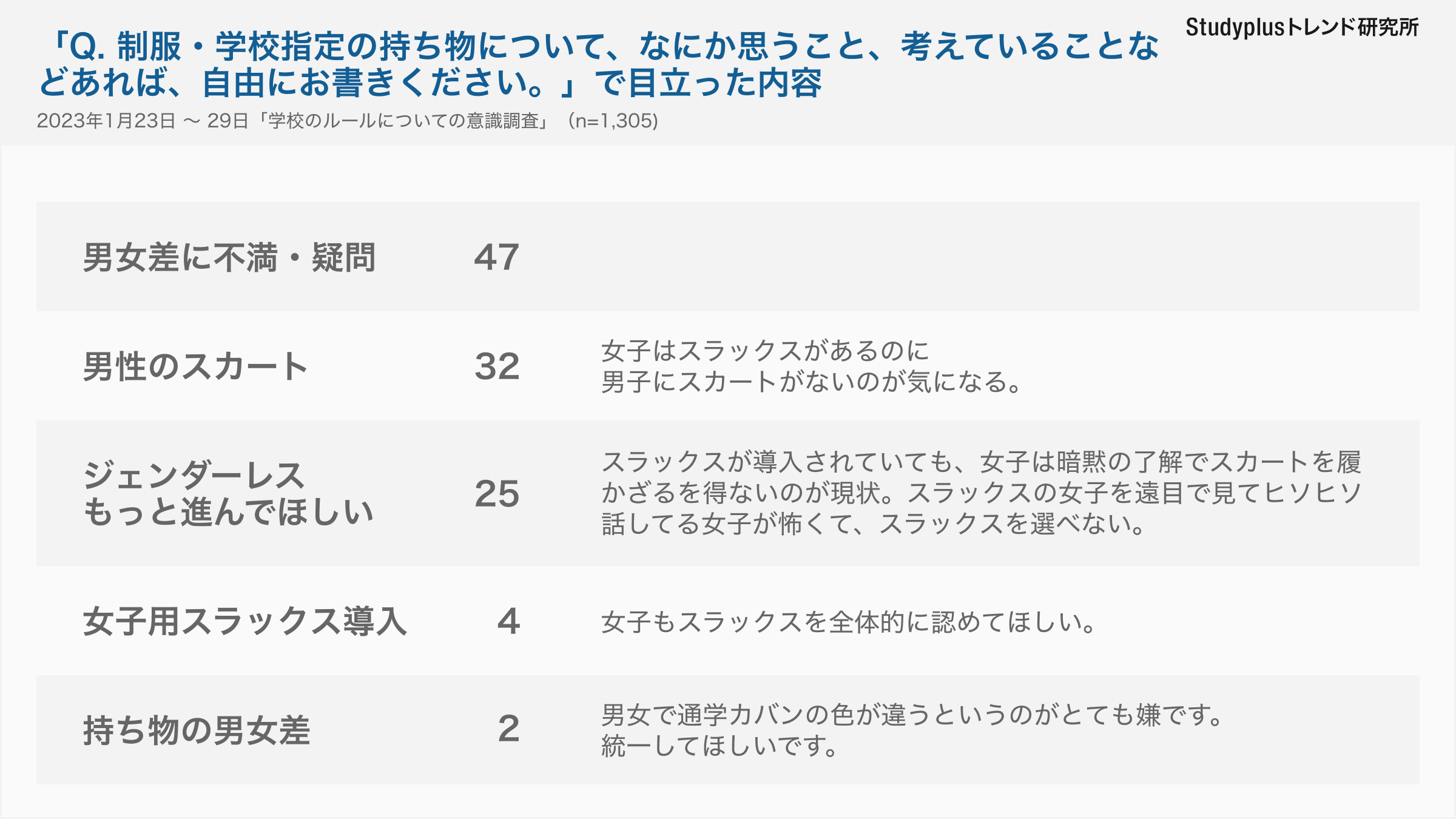 「制服・学校指定の持ち物について、なにか思うこと、考えていることなどがあれば、自由にお書きください。※中高生1,305名が任意回答」においては、以下の回答を得る(数字は人数)。