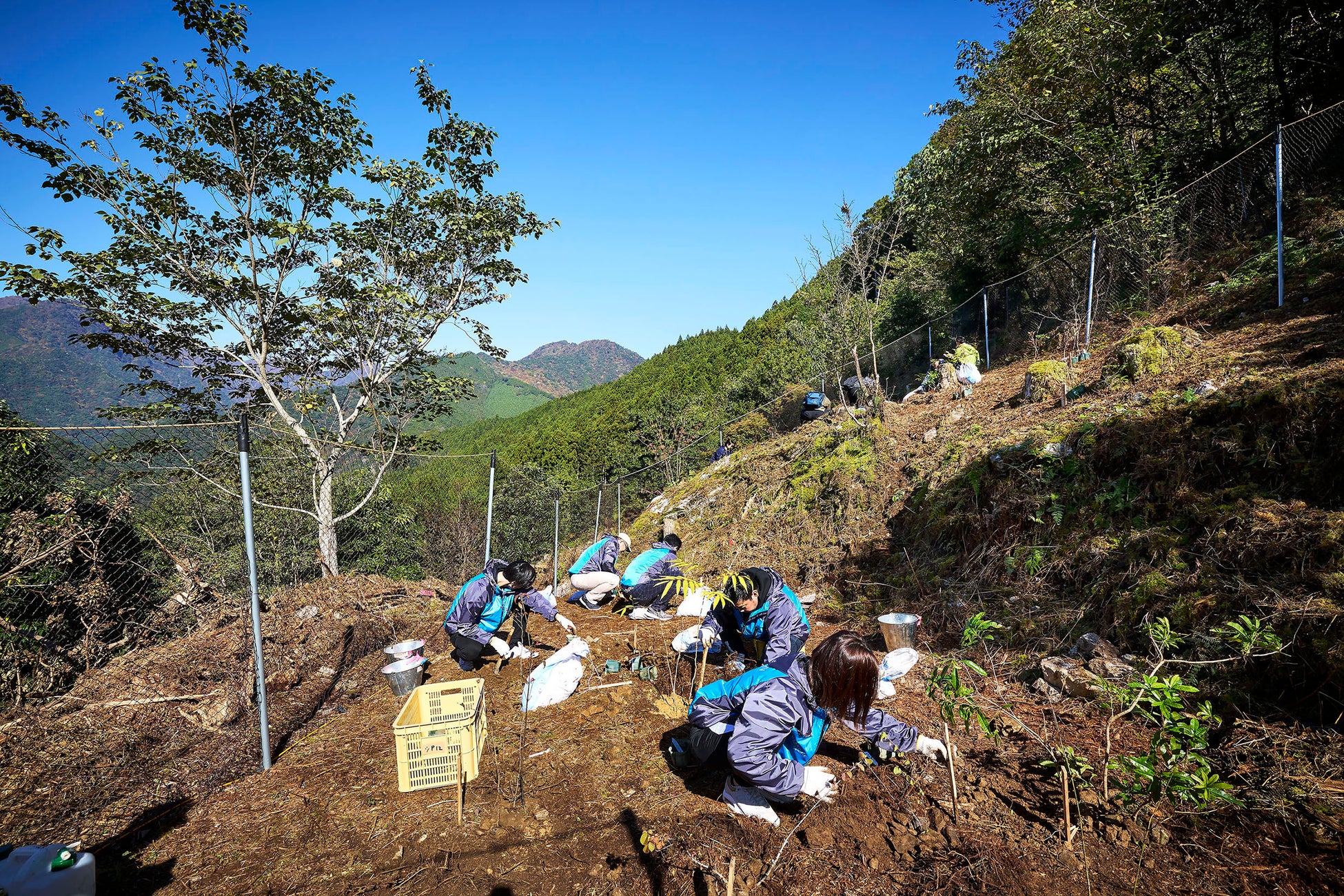 「ありがとうの森」の周辺一帯は、かつて針葉樹が植林されたエリアで、「ありがとうの森」は、その伐採跡地です。宮川森林組合(三重県多気郡大台町)のご協力のもと、新たに様々な種類の広葉樹を組み合わせて植樹することにより、地域の生物多様性を回復し、豊かな生態系を育むことができます。植樹による水源涵養効果は、防災に資するとともに、近くを流れる宮川の清流を守り、漁場環境の改善にもつながります。