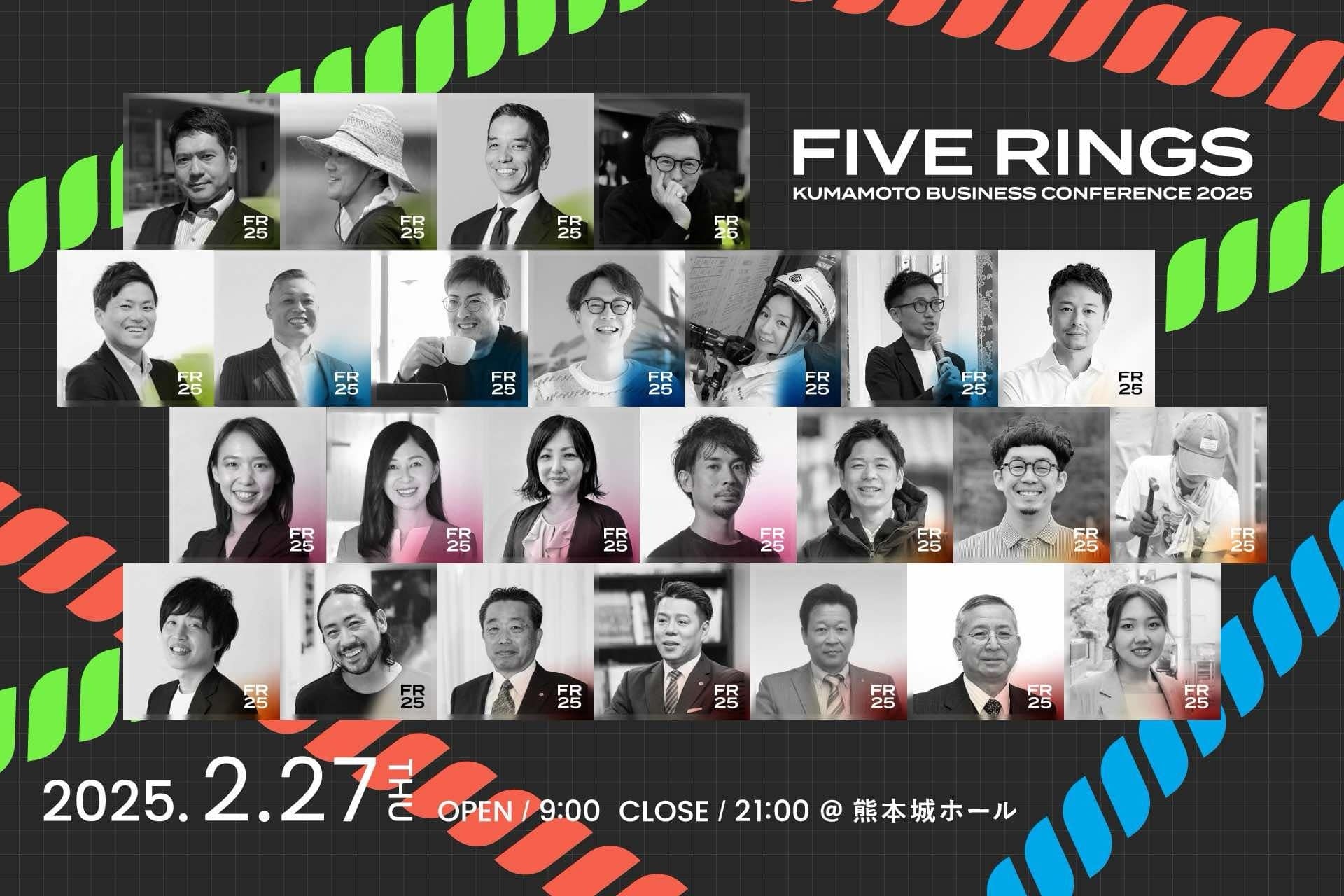 FIVE RINGSは、2024年3月に初開催された熊本発のビジネスカンファレンスです。民間企業5社(エルボーズ、サイバーレコード、肥後銀行、熊本銀行、熊本日日新聞社)で共同運営を行い、2名による講演と、20名以上が登壇する「半導体」「食」「事業承継/M&A」「人材」「文化」など5テーマのセッションを実施。