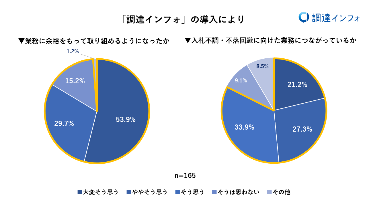 また「調達インフォ」の導入により、調達情報の収集がスピーディーに対応できるようになったことで、「業務全般において以前より余裕が持てるようになったか」については、回答者の98.8%が「大変そう思う・ややそう思う・そう思う」と回答。さらに、「調達インフォ」の各種情報を参考にすることにより、「入札の不調・不落、一社入札回避に向けた判断やそれに関連する業務につながったかどうか」についても、82.4%が「大変そう思う・ややそう思う・そう思う」と回答するなど、「調達インフォ」が調達業務の改善に寄与していることが伺えます。