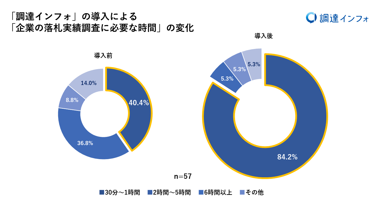 「調達インフォ」の導入による「企業の落札実績調査に必要な時間」の変化については、1案件あたりの企業の落札実績の調査にかかる平均時間が「30分~1時間」と回答した割合は、「調達インフォ」導入前が40.4%だったのに対して、導入後は84.2%と大幅にアップしております。
