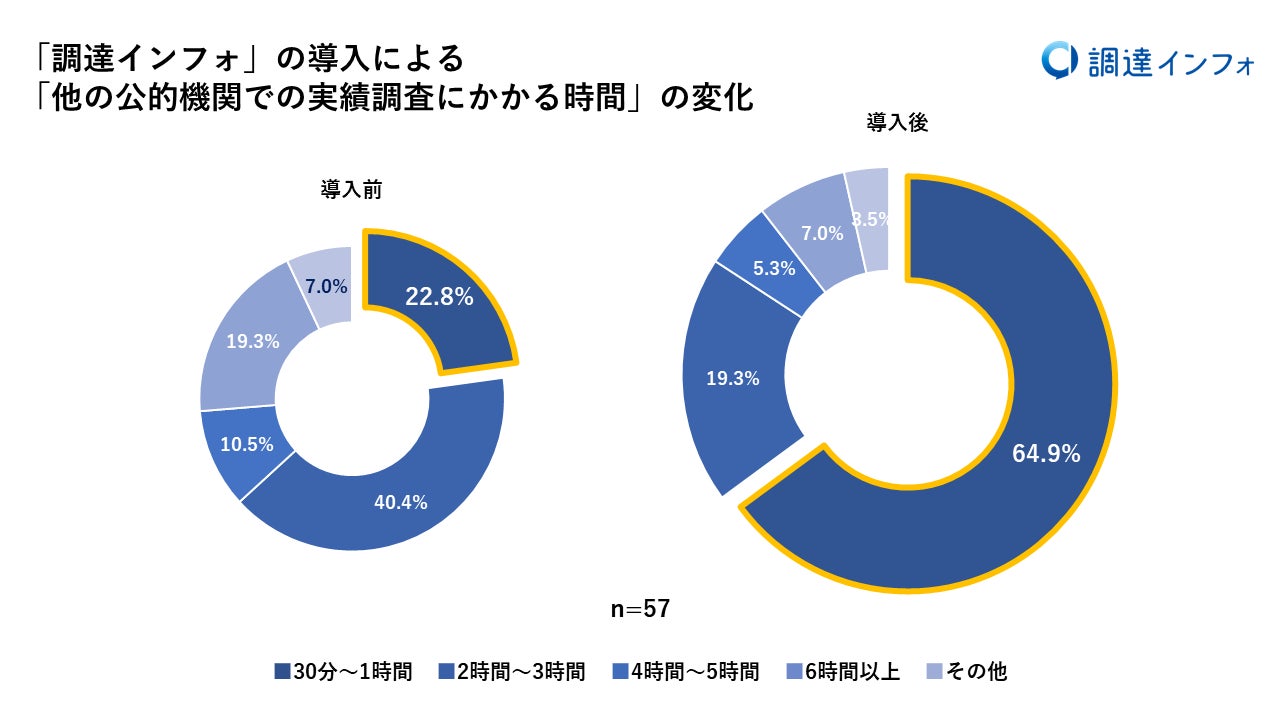 「調達インフォ」導入による「各公的機関ではじめての取り組みを実施する際に、他の公的機関での実績調査にかかる時間」の変化については、「2~3時間かかる」の回答が40.4%と最も多かったのに対して、「調達インフォ」導入後は、「30分~1時間」と回答した割合が64.9%と半数以上を占める結果となりました。