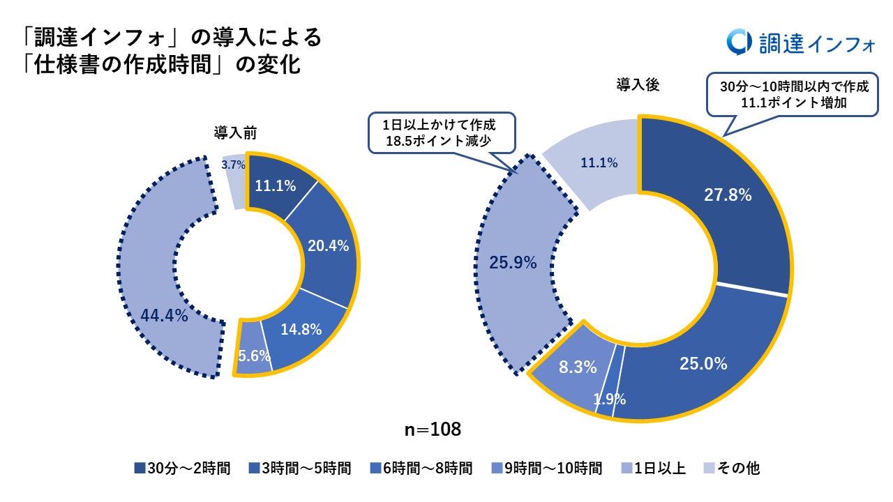 「調達インフォ」の導入による「仕様書の作成時間」の変化について聞いたところ、回答者の44.4%がこれまで仕様書の作成に1案件あたり平均1日以上を費やしていましたが、「調達インフォ」の導入後、その割合は18.5ポイント減少し、回答者の63.0%以上が30分~10時間以内で作成できるようになったと回答しました。