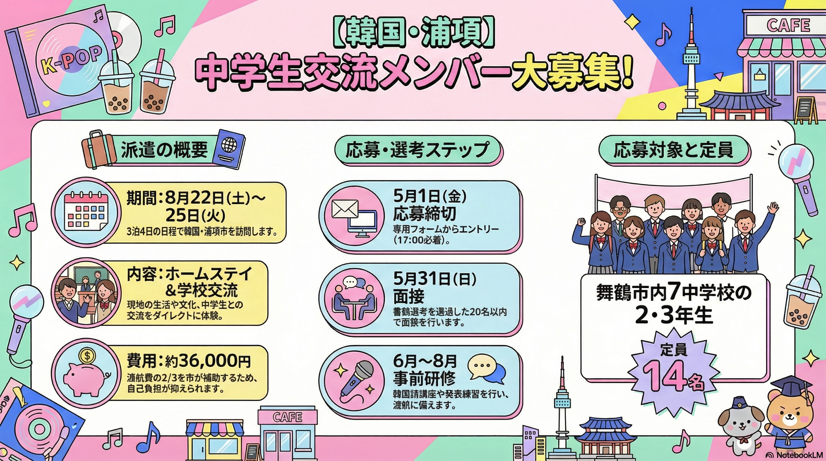 舞鶴市では、韓国・浦項(ポハン)市との親善交流の一環として、中学生を対象とした「舞鶴市青少年交流訪問団浦項市派遣事業」を実施するにあたり、参加者を募集します。