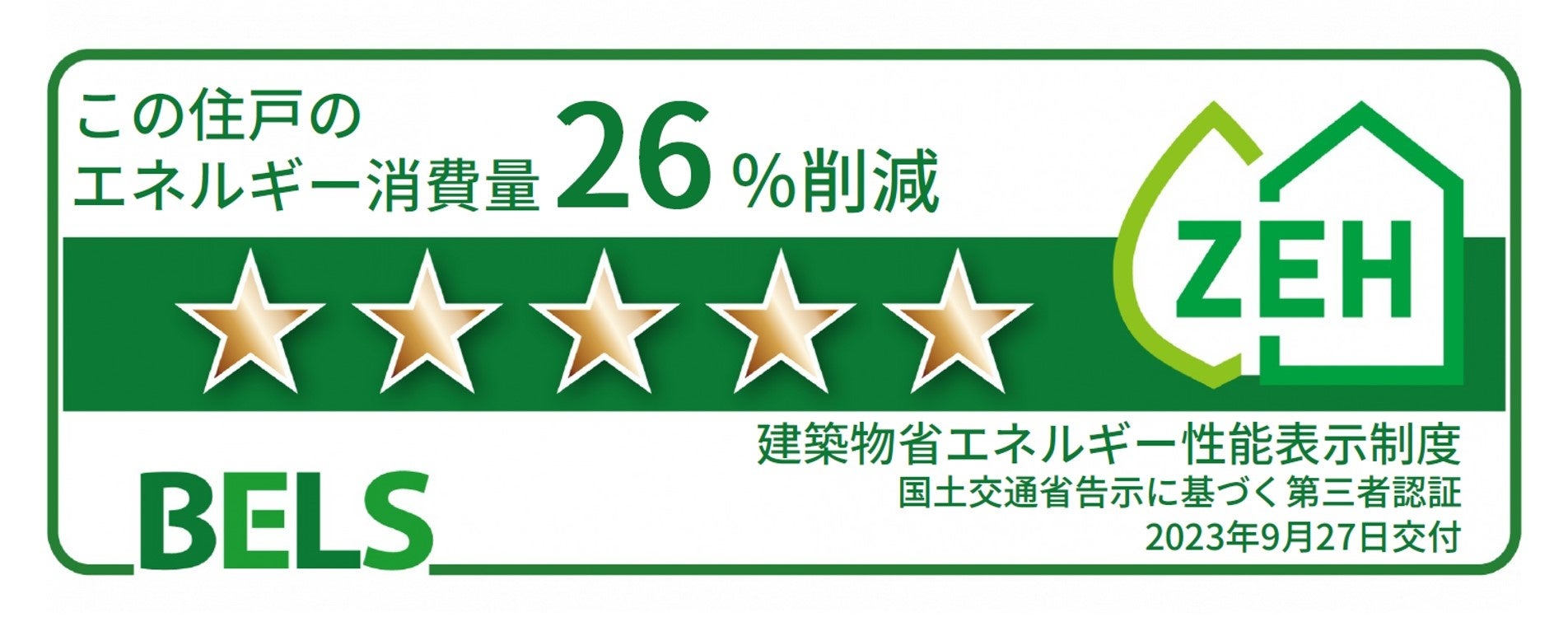 省エネ・断熱性能:建築物省エネルギー性能表示制度BELS評価「ZEH Oriented」適合、一般社団法人リノベーション協議会が定める省エネリノベーション住宅の基準「R1住宅エコ★★(ツースター)」適合。