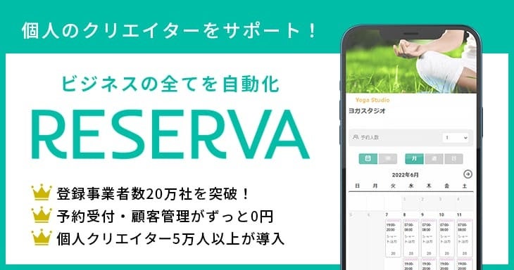 RESERVA(https://reserva.be/)は、ヘアサロン、ホテル、旅館、スクール、イベント、自治体、医療機関など20万社以上で導入。個人のクリエイターもサポート!