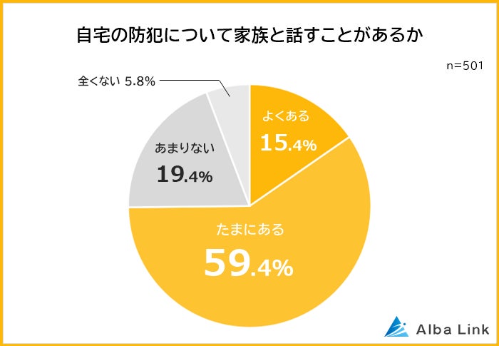 「自宅の防犯について家族と話すことがあるか」という問いには、「よくある」と回答した人が15.4%、「たまにある」と回答した人が59.4%でした。「話すことがある」という人が7割以上にのぼっています。