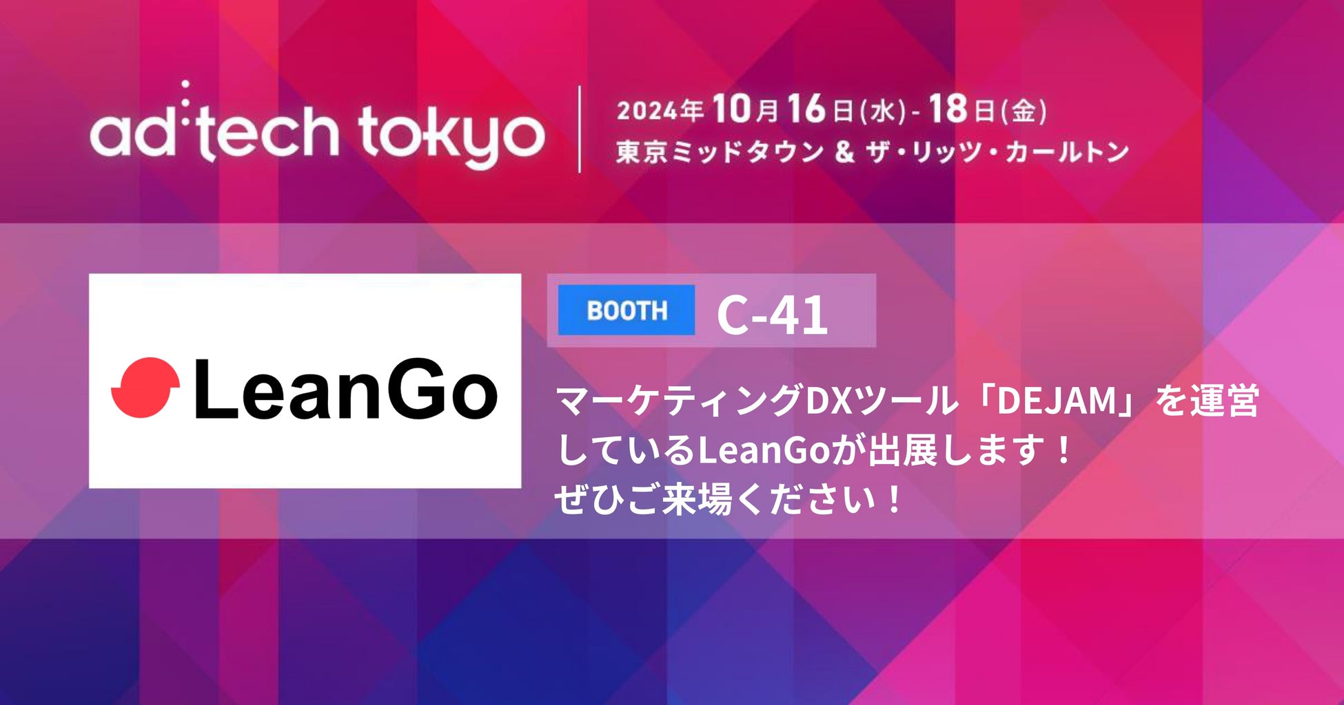 株式会社LeanGo (本社:東京都目黒区、代表取締役:平井 翔吏、以下 弊社) は、Comexposium Japan(コムエクスポジ アム・ジャパン)株式会社(本社:東京都港区、代表取締役社⻑:古市優⼦)が開催する、マーケティング国際カンファレンス「ad:tech tokyo(アドテック東京)」に、ブース出展することをお知らせいたします。なお、ブース出展期間は2024月10⽉17⽇〜18⽇で、開催場所は東京ミッドダウン&ザ・リッツ・カールトン東京です。
