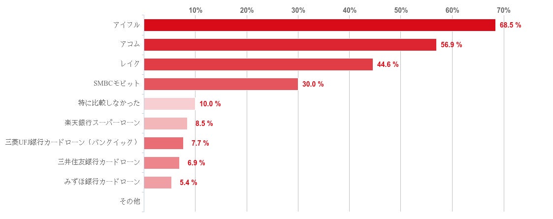 プロミスと同じ大手の消費者金融を比較対象としている人が多かった。プロミスで即日の借入を検討している人が、他の消費者金融の審査スピードや手続きの利便性などを比べていると考えられる。