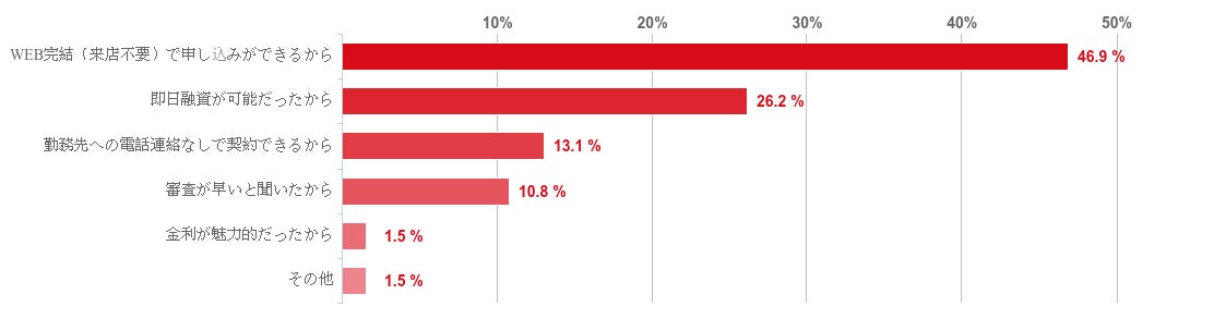 最も多かったのはWeb完結で申し込める点で46.9%だったが、プロミスで即日融資が可能なことを理由に借入先として選んだ人も26.2%いた。