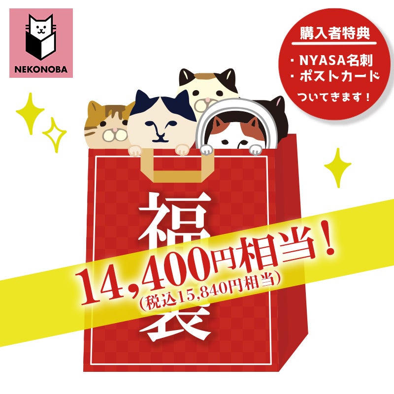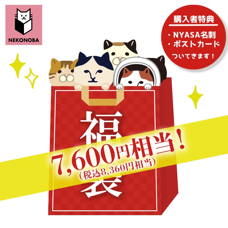 題して、「猫賀新年NEKONOBA福袋」! Aセット 税抜3,800円(税込4,180円。元売価は税込8,360円相当)と、Bセット 税抜7,200円(税込7,920円。元売価は税込15,840円相当)の2パターンご用意しました。どちらもオリジナルグッズを詰め合わせしてお届けします。購入者特典として、「NYASA名刺」と「ポストカード」がもれなくついてきます。