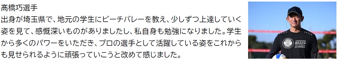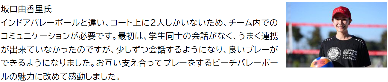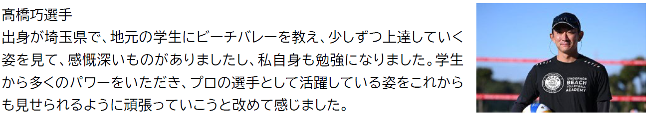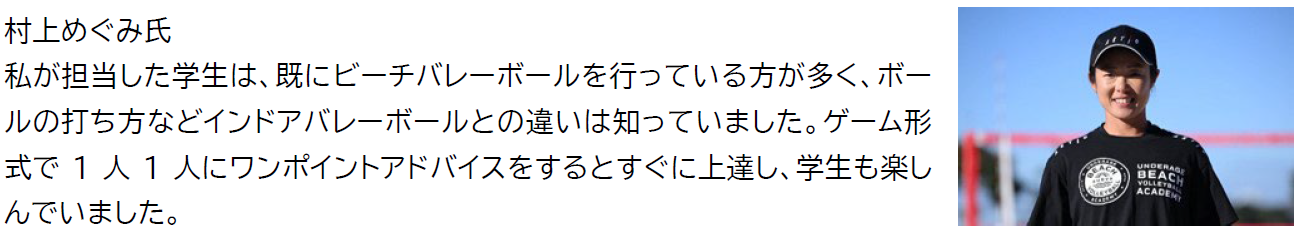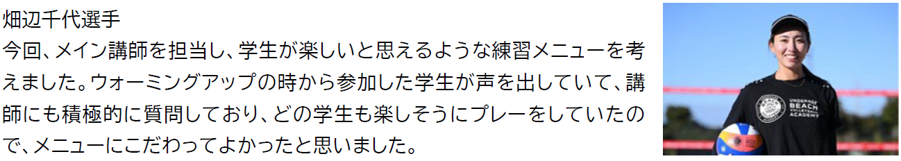 普段はプロの選手から直接、テクニックや考え方などを教えもらうことはないので、とても有意義な時間を過ごすことができました。ボールの打ち方などインドアバレーボールとの違いを知れたのは勉強になり、すぐに実践してみようと思います。