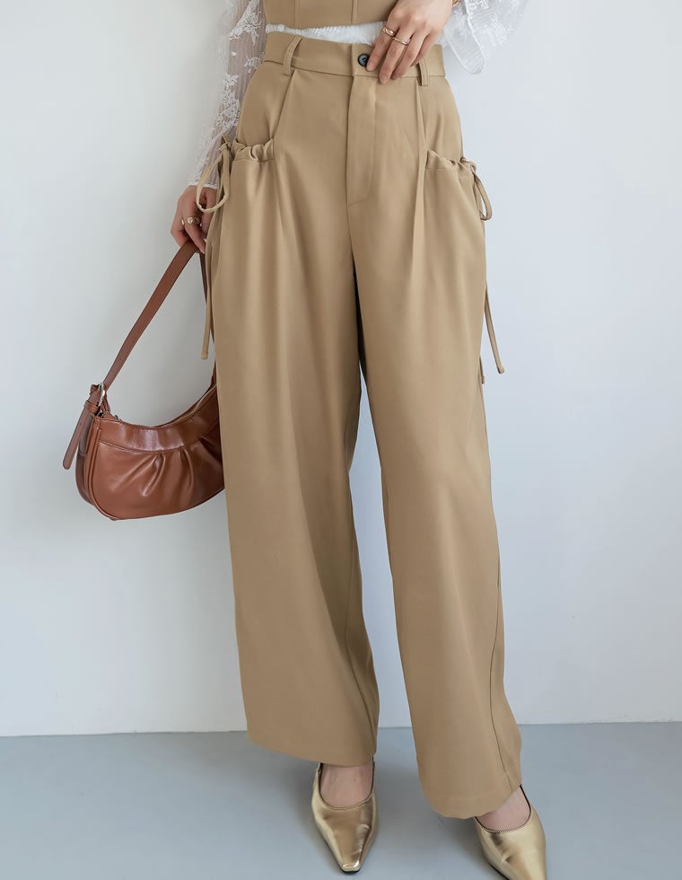 ゆるやかに広がるバルーンシルエットとポケットのギャザーリボンが特徴のパンツ。