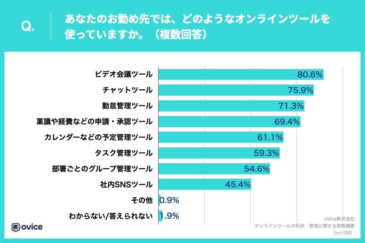 「Q.あなたのお勤め先では、どのようなオンラインのツールを使っていますか。(複数回答)」(n=108)と質問したところ、「ビデオ会議ツール」が80.6%、「チャットツール」が75.9%、「勤怠管理ツール」が71.3%という回答となりました。