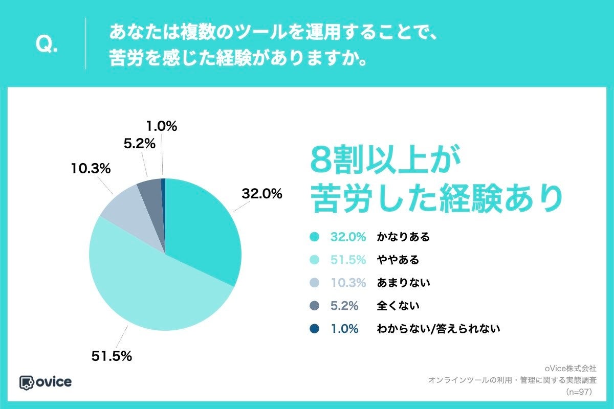 使用しているオンラインツールの数に関する質問で「2~3つ」「4~5つ」「6つ以上」と回答した方に、「Q.あなたは複数のツールを運用することで、苦労を感じた経験がありますか。」(n=97)と質問したところ、「かなりある」が32.0%、「ややある」が51.5%という回答となり、8割以上が苦労した経験があることがわかりました。
