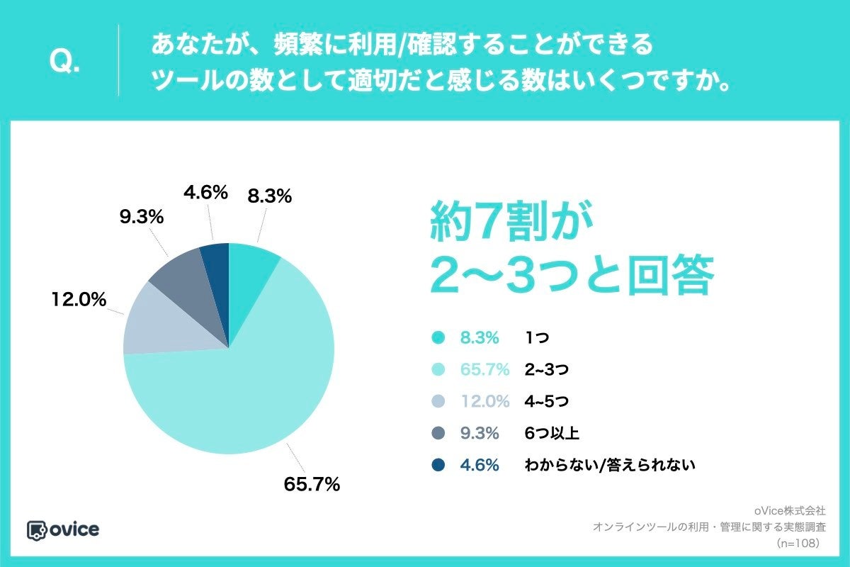 「Q.あなたが、頻繁に利用/確認することができるツールの数として適切だと感じる数はいくつですか。」(n=108)と質問したところ、「2~3つ」が65.7%という回答となりました。