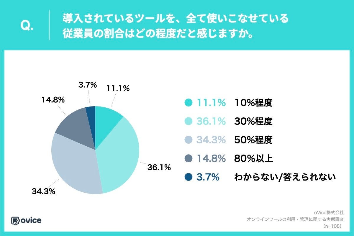 「Q.導入されているツールを、全て使いこなせている従業員の割合はどの程度だと感じますか。」(n=108)と質問したところ、「30%程度」が36.1%、「50%程度」が34.3%という回答となりました。