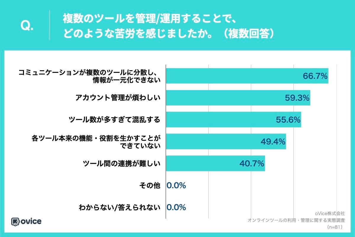 上記質問で「かなりある」「ややある」と回答した方に、「Q.複数のツールを管理/運用することで、どのような苦労を感じましたか。(複数回答)」(n=81)と質問したところ、「コミュニケーションが複数のツールに分散し、情報が一元化できない」が66.7%、「アカウント管理が煩わしい」が59.3%、「ツール数が多すぎて混乱する」が55.6%という回答となりました。