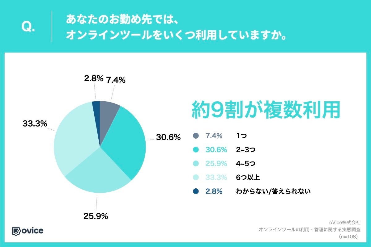 「Q.あなたのお勤め先では、オンラインツールをいくつ利用していますか。」(n=108)と質問したところ、「2~3つ」が30.6%、「4~5つ」が25.9%、「6つ以上」が33.3%という回答となりました。約9割の方が、複数のオンラインツールを日常的に使用していることがわかりました。