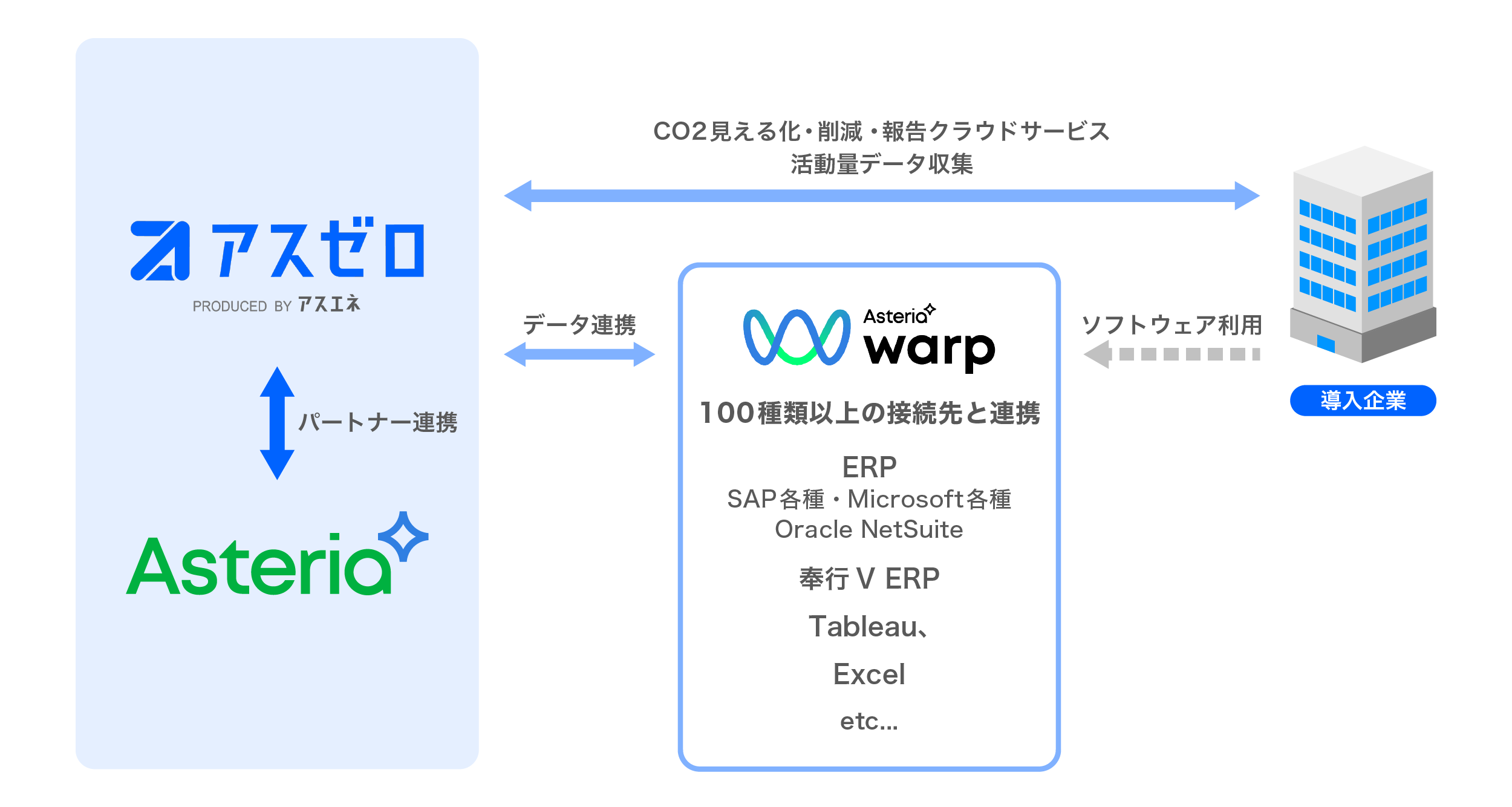 CO2排出量見える化・削減・報告クラウドサービス「アスゼロ」を提供するアスエネ株式会社(本社:東京都港区、代表取締役CEO:西和田 浩平、以下「アスエネ」)と、アステリア株式会社(本社:東京都渋谷区、代表取締役社長:平野 洋一郎、証券コード:3853、以下 「アステリア」)は、企業データ連携(EAI/ESB)製品の国内ソフトウェア市場で16年間連続シェアNo.1 ※1 を獲得している「ASTERIA Warp」(アステリアワープ、以下Warp)のサブスクリプション(月額課金)型製品の販売代理店である「ASTERIA Warp サブスクリプション パートナー(以下ASP)」契約を締結したことを発表します。