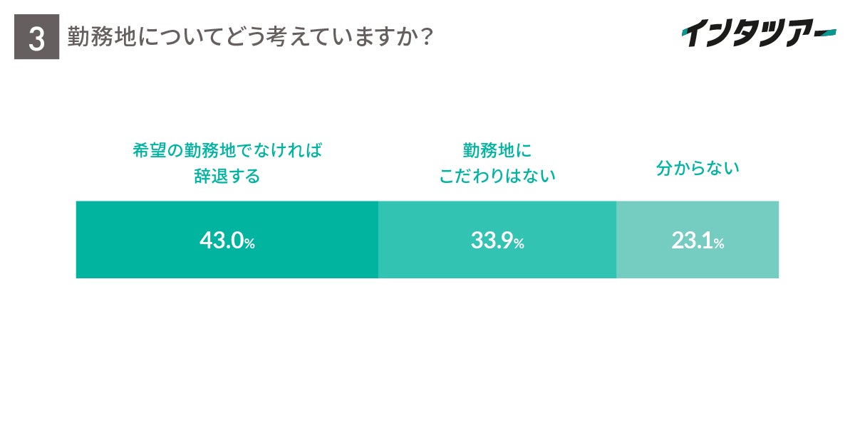 「希望の勤務地でなければ辞退する」が43.0%を占め、勤務地が入社企業選びの大きな軸の一つとなっていることが伺えます。