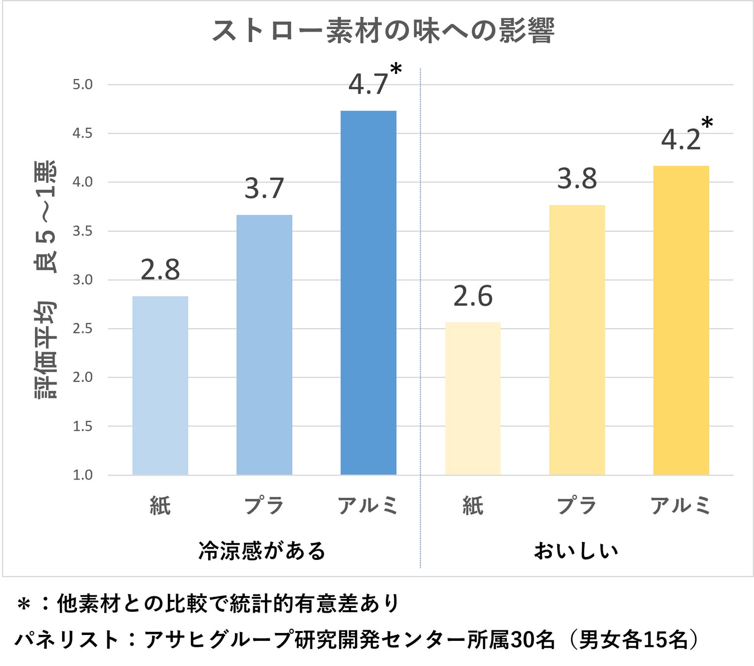 アサヒユウアス(株)はアサヒグループ研究開発センターで商品の官能検査を実施し、アルミストローの吸い心地や形状設計などを監修しました。官能検査の結果、紙製ストローやプラスチック製ストローと比較して、アルミ製ストローの方が飲んだ際の冷涼感とおいしさを強く感じることが分かりました。