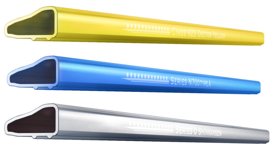 本ストローは、アルミニウムの押出製法で製造しています。カラーは、アルミニウムのカラーアルマイト処理※1を行い、各車体を想起させる色付けをしています。また、UACJ押出加工の精密な押出技術により、飲み口の断面は、新幹線の先頭車両をモチーフとし、車輪も付けくわえることでよりリアリティのある形状を実現しました。
