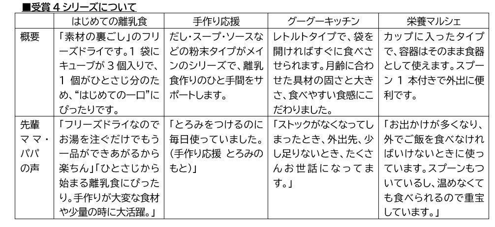 和光堂ブランドのベビーフード4シリーズ「はじめての離乳食」「手作り応援」「グーグーキッチン」「栄養マルシェ」が受賞
