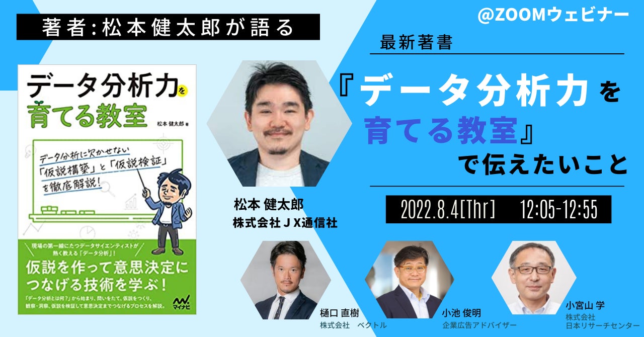 - 内 容: 本ウェビナーは、数々のマーケティング書籍を手掛ける松本健太郎さん(レギュラーパネラー)から、最新著書『データ分析力を育てる教室』で伝えたいことを徹底解説していただきます。本書で解説されている、データとは何か、データ分析から何がわかるのか、何のためにデータ分析を行うのか、「仮説構築」と「仮説検証」の内容から、松本様がお伝えしたい点をさらにピックアップしていただき、レギュラーパネラーとの対話形式で紐解いていきます。