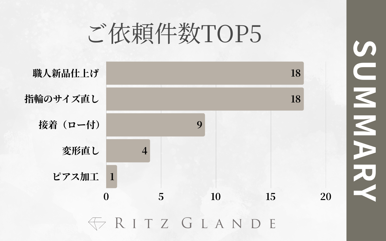 北海道札幌市のジュエリー修理・リフォーム専門店のRITZ GLANDEは、2025年12月にご依頼いただいた内容を集計いたしましたので上位5位までをランキング別にご紹介します。