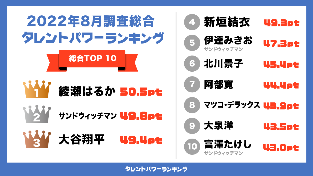 「タレントパワーランキング」2022年8月度調査(第3四半期)の総合トップ10を発表!