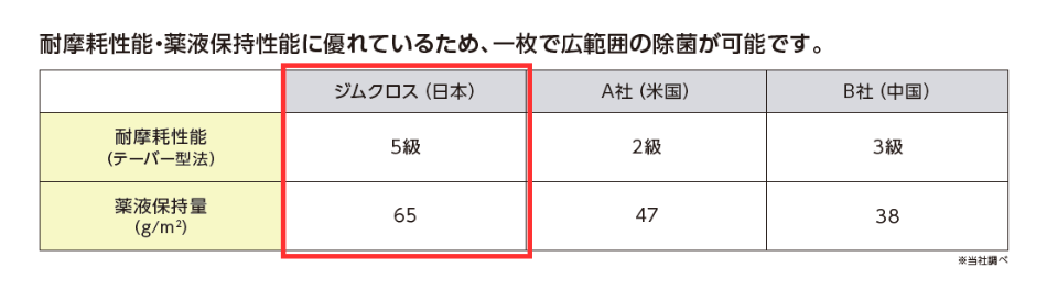 耐摩耗性能、特殊製法による高い薬液保持性能に優れ、一枚で広範囲の除菌が可能です。