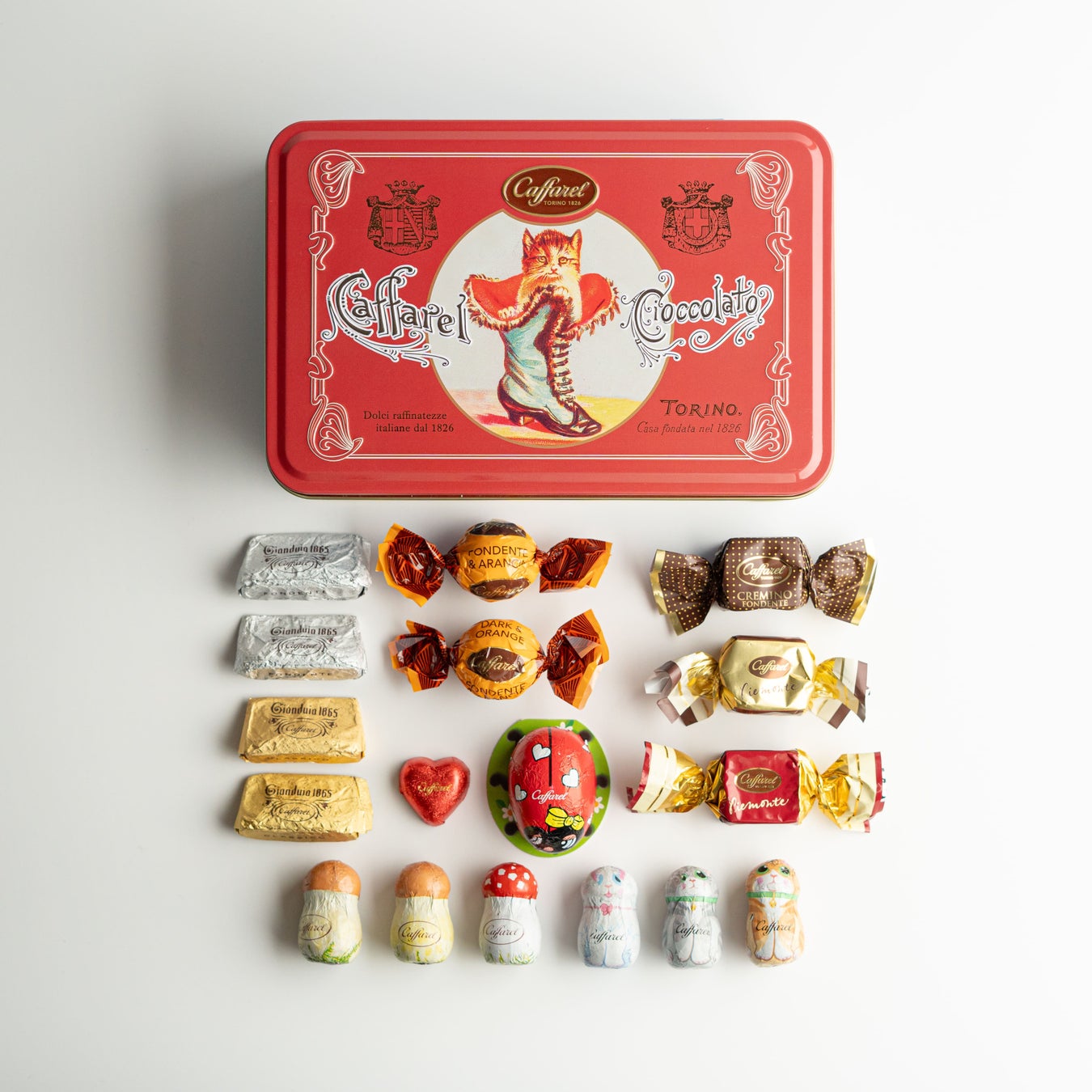 詳細:過去のコレクションの中でも特に人気の高い長靴のねこ缶がデザインをリニューアルして2025年版として再登場。グレイッシュブルーにスカーレットのツートンカラーがクラシカルな雰囲気をひきたてます。蓋のデザインに一部エンボス加工が施された蝶番缶。カファレル定番人気のジャンドゥーヤ、ピエモンテに加え、ダーククレミノキューブやきのこ、てんとう虫などのホイルチョコレートなど全17粒をアソート。