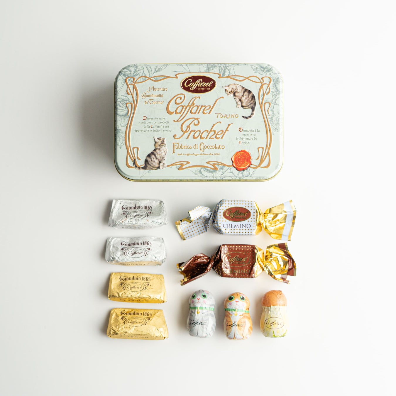 詳細:淡いミントカラーをベースに全面にボタニカル柄が施され、向かい合った子猫たちのイラストが可愛い、上品で落ち着いたデザインのスクエア缶。カファレル定番人気のジャンドゥーヤをはじめ、クレミノキューブやきのこ、キュートなねこのホイルチョコレートなど全9粒をアソート。