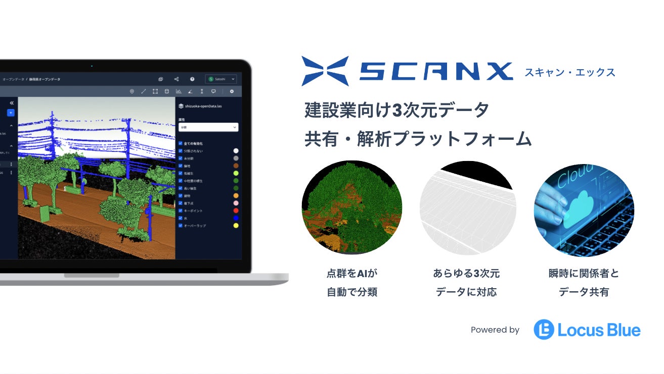 ローカスブルーが販売する「ScanX(スキャン・エックス)※」は、3Dデータをオンライン上で処理・解析できるクラウド型のソフトウェアです。従来のスタンドアロン型点群処理ソフトウェアの課題を解決し、国内外の約10,000超の建設、土木、測量現場で活用されています。