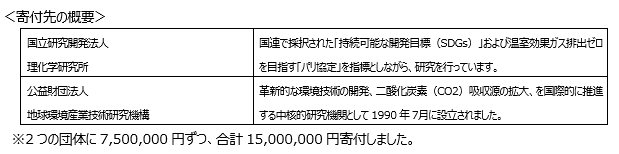 このたび、当ファンドを通じて得られる当社収益の一部を、主として脱炭素化社会実現に向けた取り組みやイノベーションに貢献する研究等を支援することによる社会貢献を目的として、寄付を行いました。寄付先は、「国立研究開発法人理化学研究所」、「公益財団法人地球環境産業技術研究機構」です。