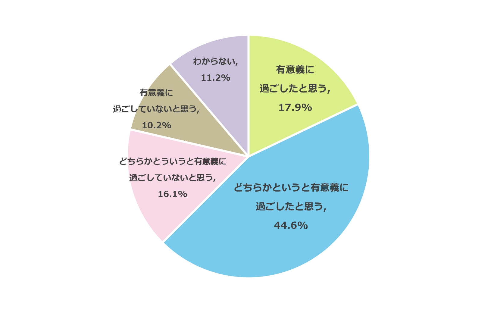 昨年の夏休みの過ごし方について、子どもは有意義に過ごしたと思うか質問したところ、62.5%が「有意義に過ごしたと思う」(有意義に過ごしたと思う:17.9%、どちらかというと有意義に過ごしたと思う:44.6%)、26.3%が「有意義に過ごしていないと思う」(有意義に過ごしていないと思う:10.2%、どちらかとういうと有意義に過ごしていないと思う:16.1%)と回答しました。