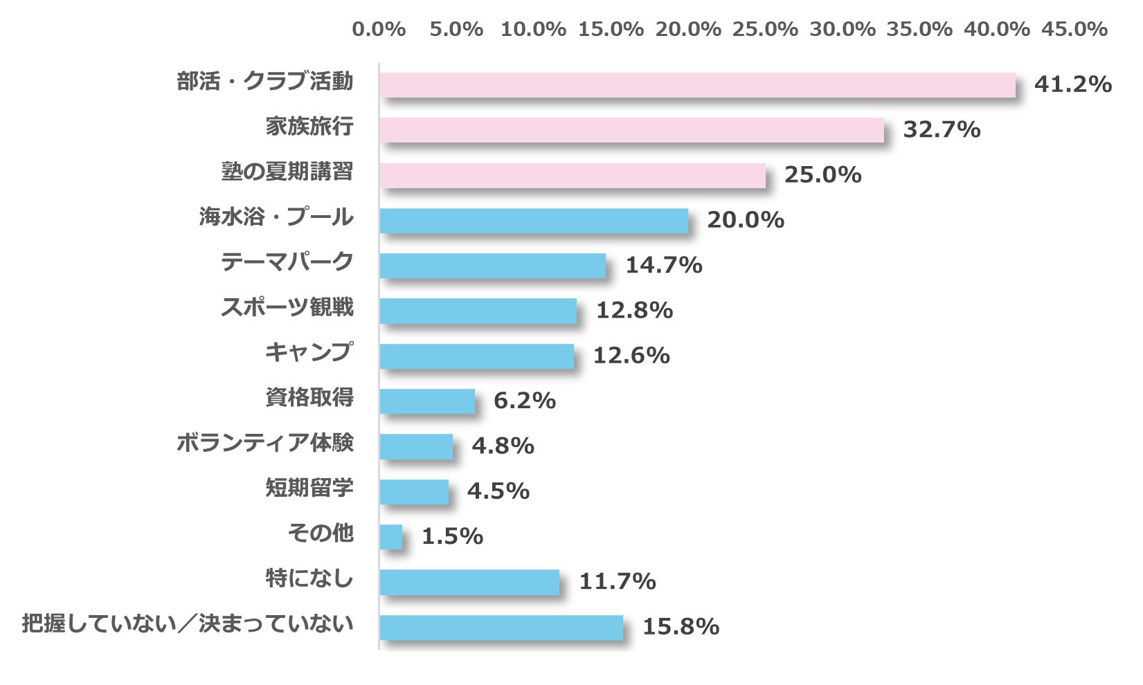 子どもの夏休みの予定について質問したところ、最多回答は「部活・クラブ活動(41.2%)」、次に「家族旅行(32.7%)」、「塾の夏期講習(25.0%)」と続きました。