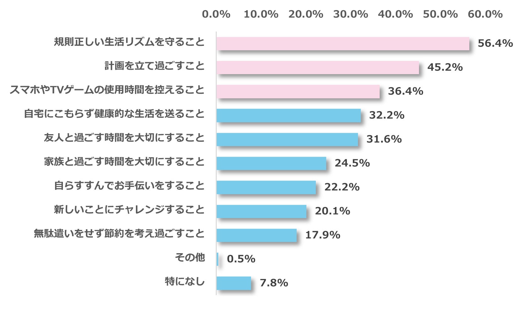 夏休みの期間中、生活面で子どもに望むことについて質問したところ、最多回答は「規則正しい生活リズムを守ること(56.4%)」、次に「計画を立て過ごすこと(45.2%)」、「スマホやTVゲームの使用時間を控えること(36.4%)」と続きました。